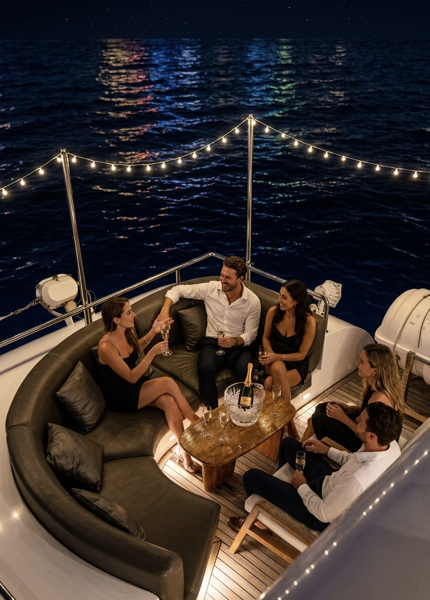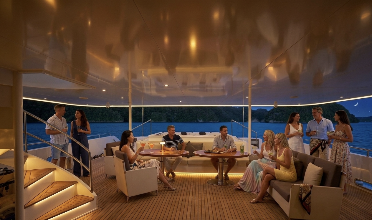 Вечером — ужин под открытым небом, возможно барбекю, мягкий свет палубы и ощущение завершённости.