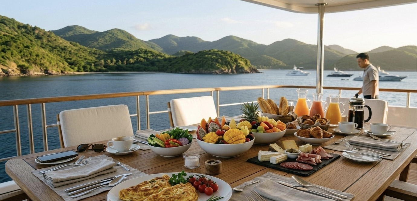 На борту 12 кают разных категорий: Master, Deluxe Twin и Sea View. В каждой — кондиционер, телевизор, горячий душ, сейф и панорамный вид на море. Интерьер выполнен в тёплой палитре с натуральными текстурами — спокойно, светло и без излишнего декора. Здесь легко отдыхать по-настоящему.