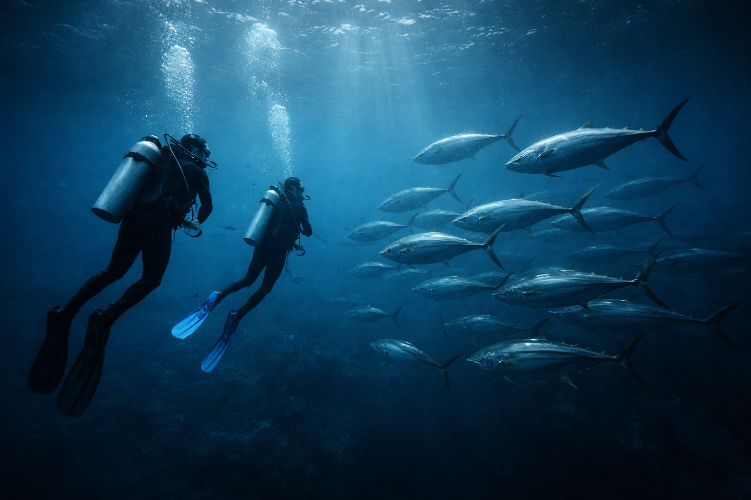 Иногда из синевы появляются акулы, стаи тунцов или скаты.