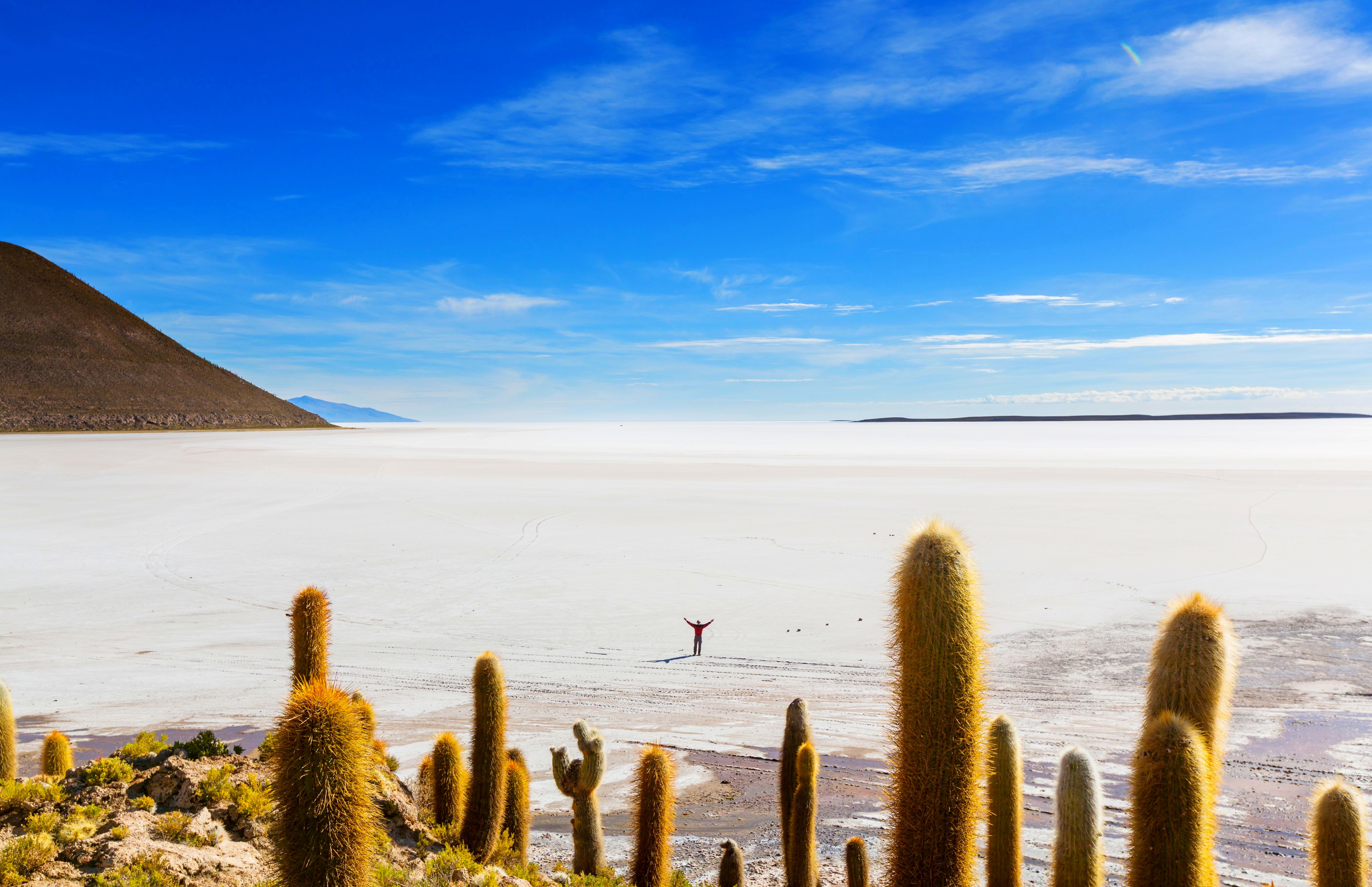 После катим на остров Инкауаси, известный своими гигантскими кактусами, которые достигают 10 метров в высоту и могут быть старше 1000 лет! Этот остров древний вулкан, который расширился в соляное плато. Пересекаем соленое озеро и оказываемся в Галактических пещерах. Подводные пещеры образовались из-за взрыва вулкана над водами Лаго Мьючи (Салар сегодня). Продолжаем движение к Сан-Хуан Аймаре. Отсюда дикими тропками карабкаемся на самый верх.