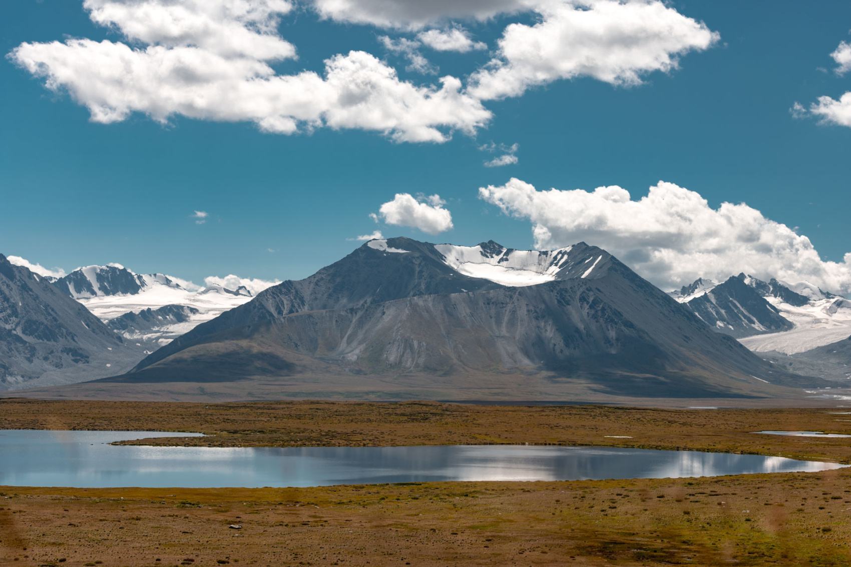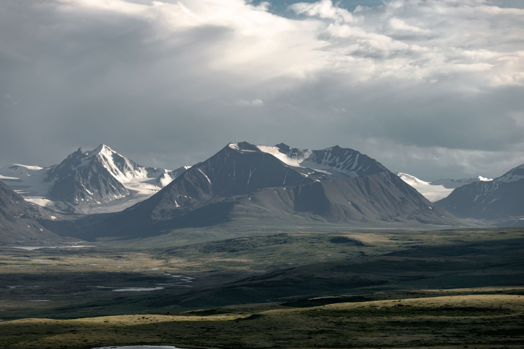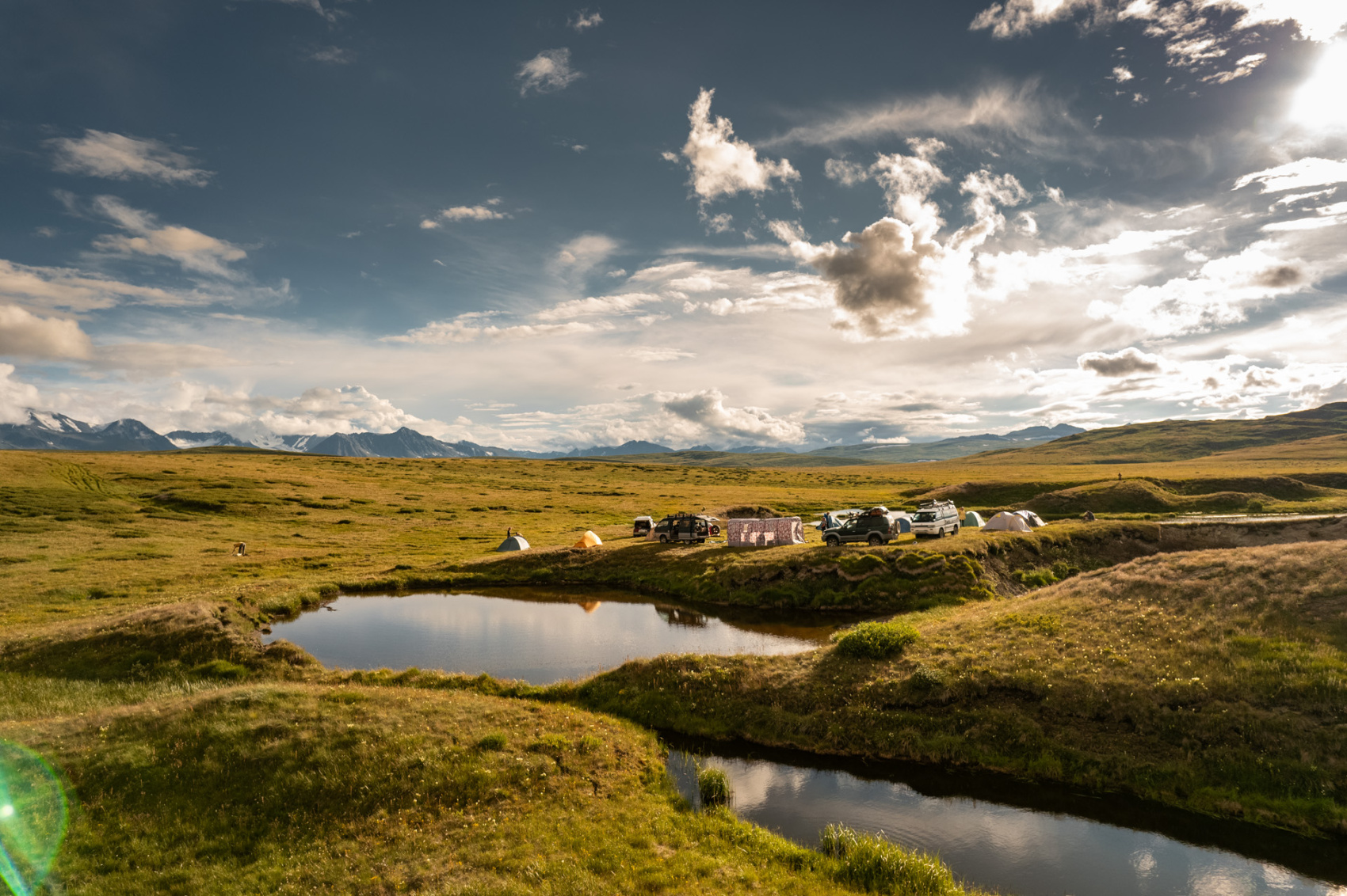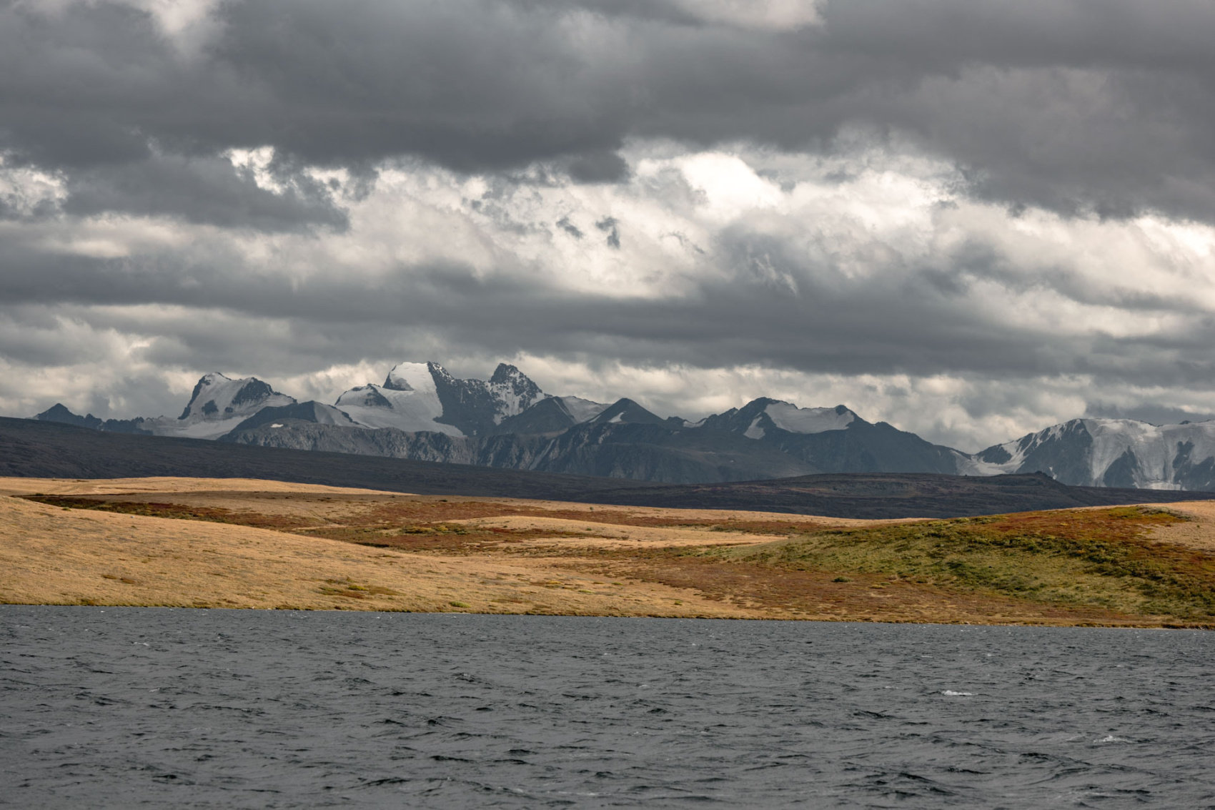 Сегодня мы заходим на само плато Укок через Джумалиские ключи и перевал Тёплый ключ (2900м), где всё еще лежит снег. Повторно проходим приграничный контроль и разбиваем лагерь на видовой точке у реки Аргамджи с видами на горный массив Табын-Богдо-Ола. С сегодняшнего дня мы будем наслаждаться уединением и видами на вторую вершину Алтая, гору Найрамдал или Куйтен-Уул (4374м).