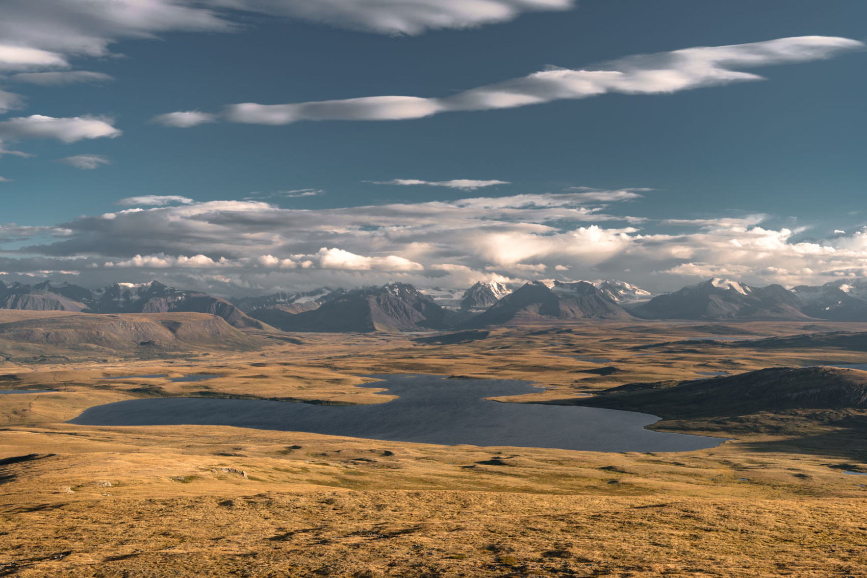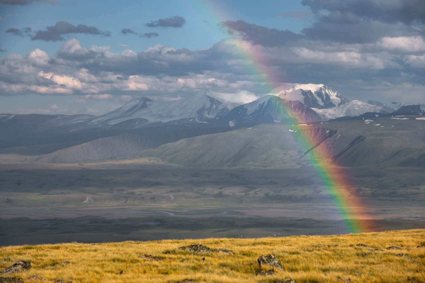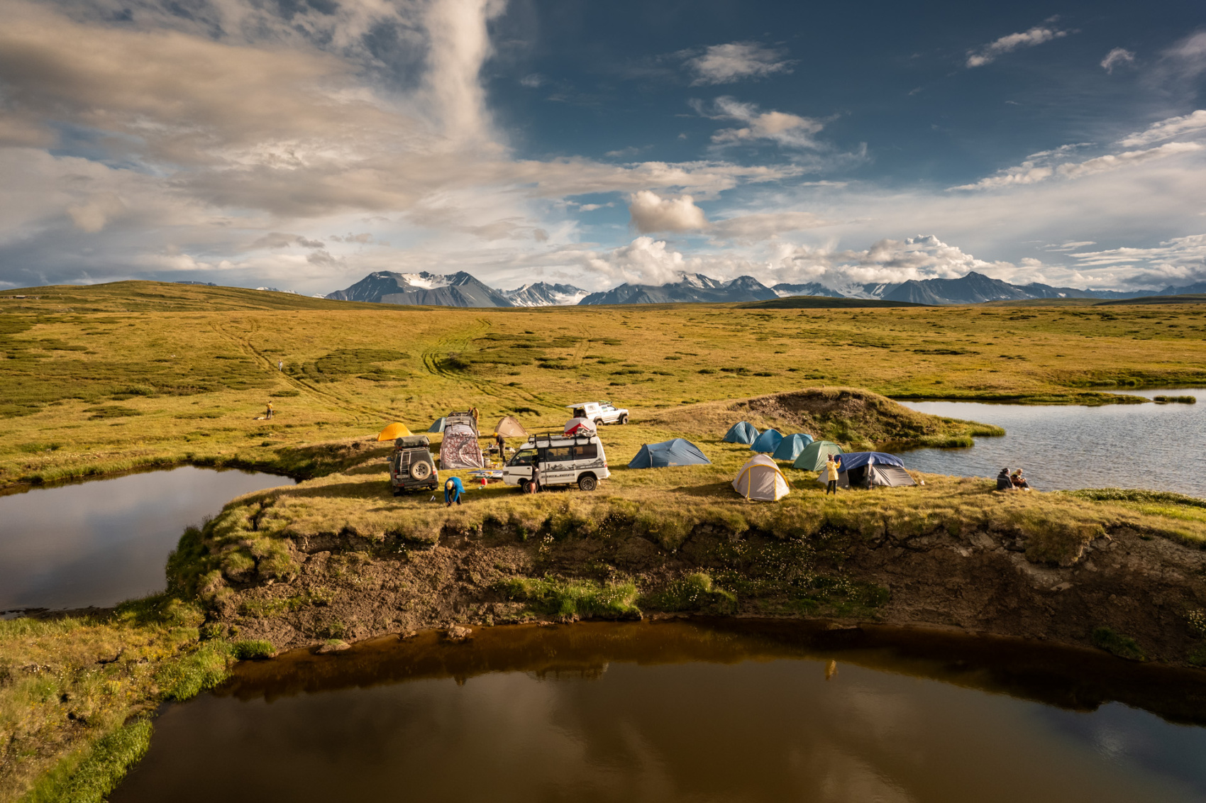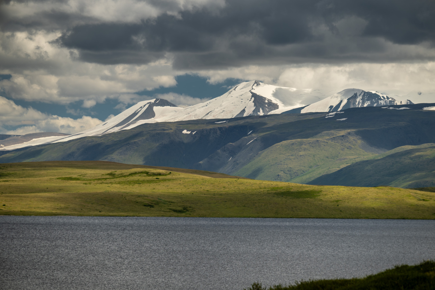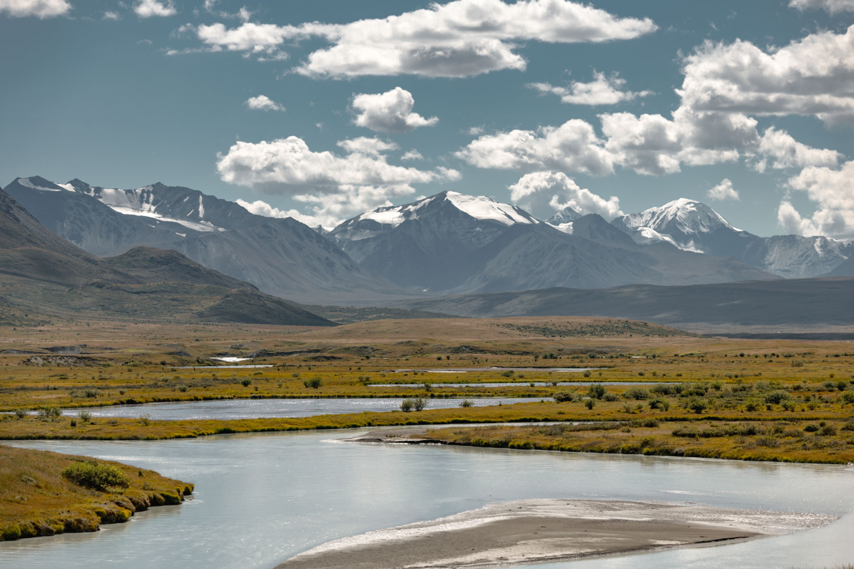 Сегодня мы заходим на само плато Укок через Джумалиские ключи и перевал Тёплый ключ (2900м), где всё еще лежит снег. Повторно проходим приграничный контроль и разбиваем лагерь на видовой точке у реки Аргамджи с видами на горный массив Табын-Богдо-Ола. С сегодняшнего дня мы будем наслаждаться уединением и видами на вторую вершину Алтая, гору Найрамдал или Куйтен-Уул (4374м).