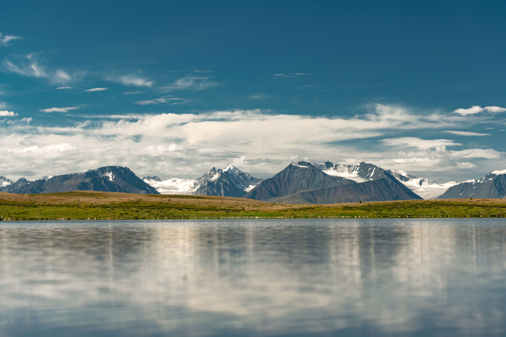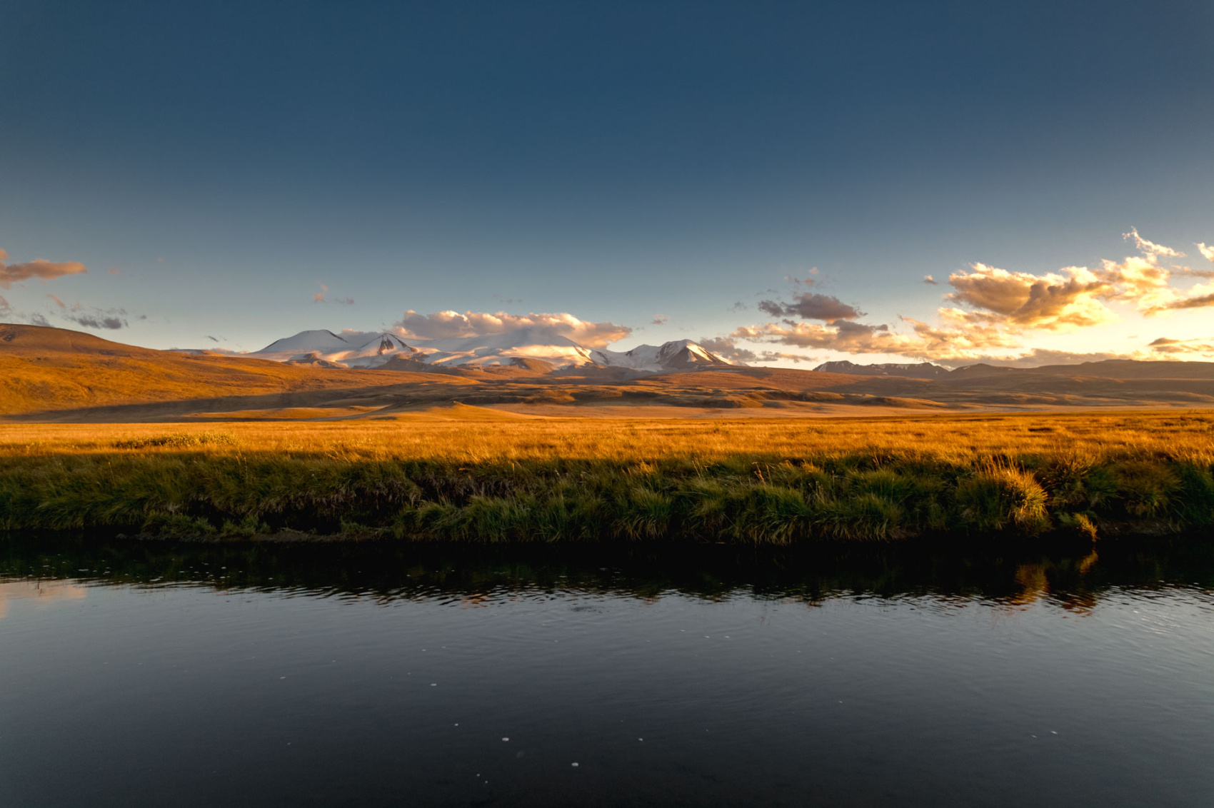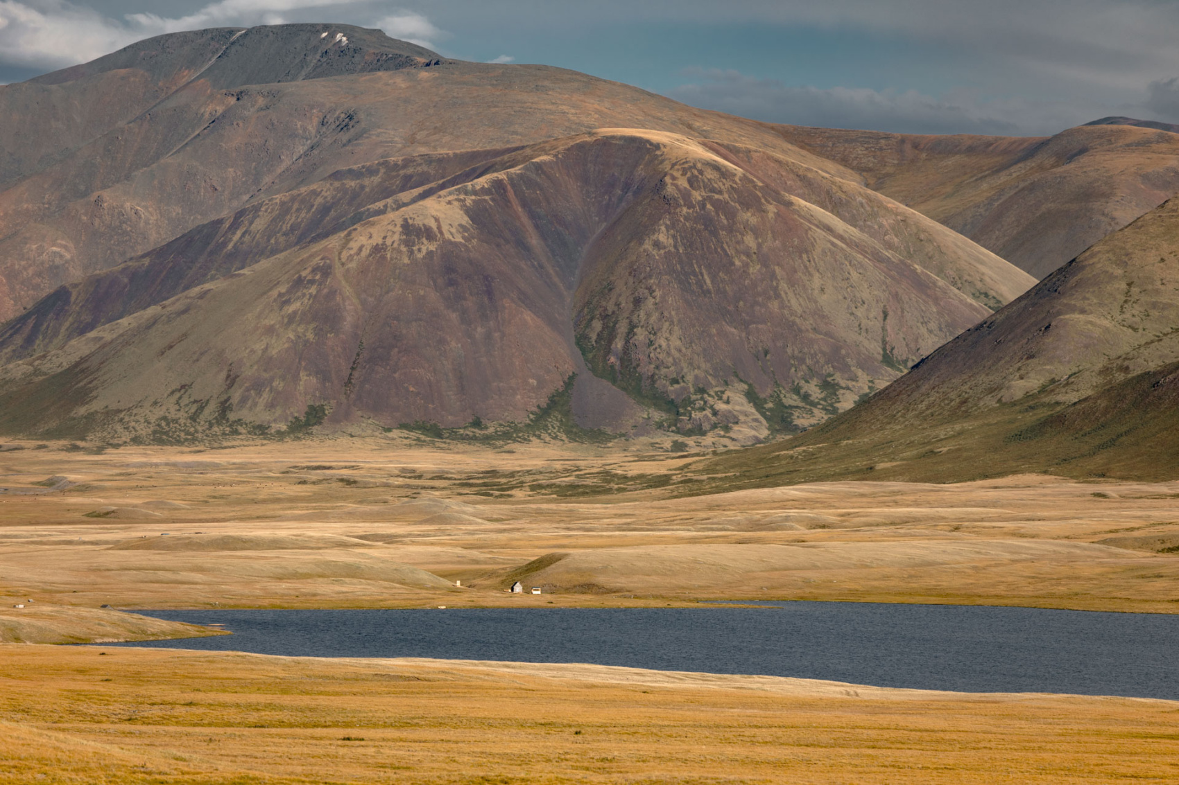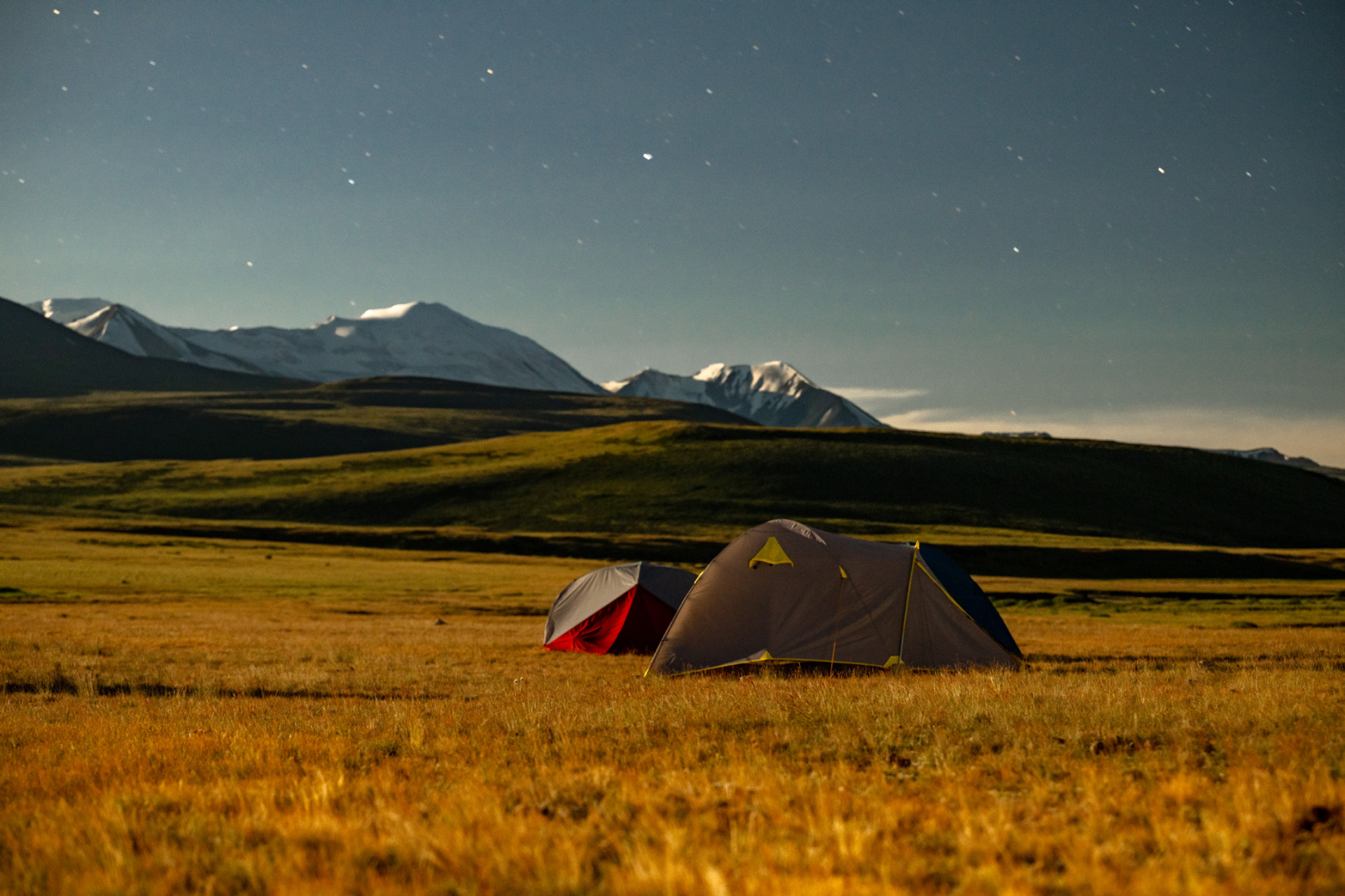 Сегодня мы заходим на само плато Укок через Джумалиские ключи и перевал Тёплый ключ (2900м), где всё еще лежит снег. Повторно проходим приграничный контроль и разбиваем лагерь на видовой точке у реки Аргамджи с видами на горный массив Табын-Богдо-Ола. С сегодняшнего дня мы будем наслаждаться уединением и видами на вторую вершину Алтая, гору Найрамдал или Куйтен-Уул (4374м).