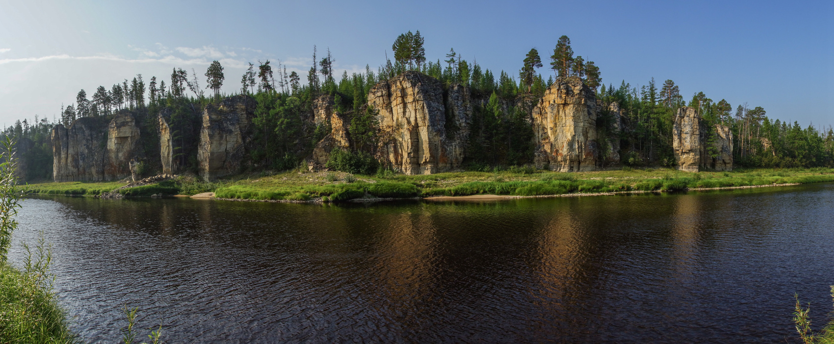 Синяя (по-якутски Сиинэ) относительно небольшая и очень извилистая река, левый приток Лены. Её устье слишком маловодно даже для катера, поэтому единственный способ знакомства с её красотами резиновая лодка. Главная достопримечательность Синей Синские столбы, 37 групп скал, разбросанных на 120-километровом участке русла. По сравнению с Ленскими столбами они не столь грандиозны, но более изящны и вычурны.