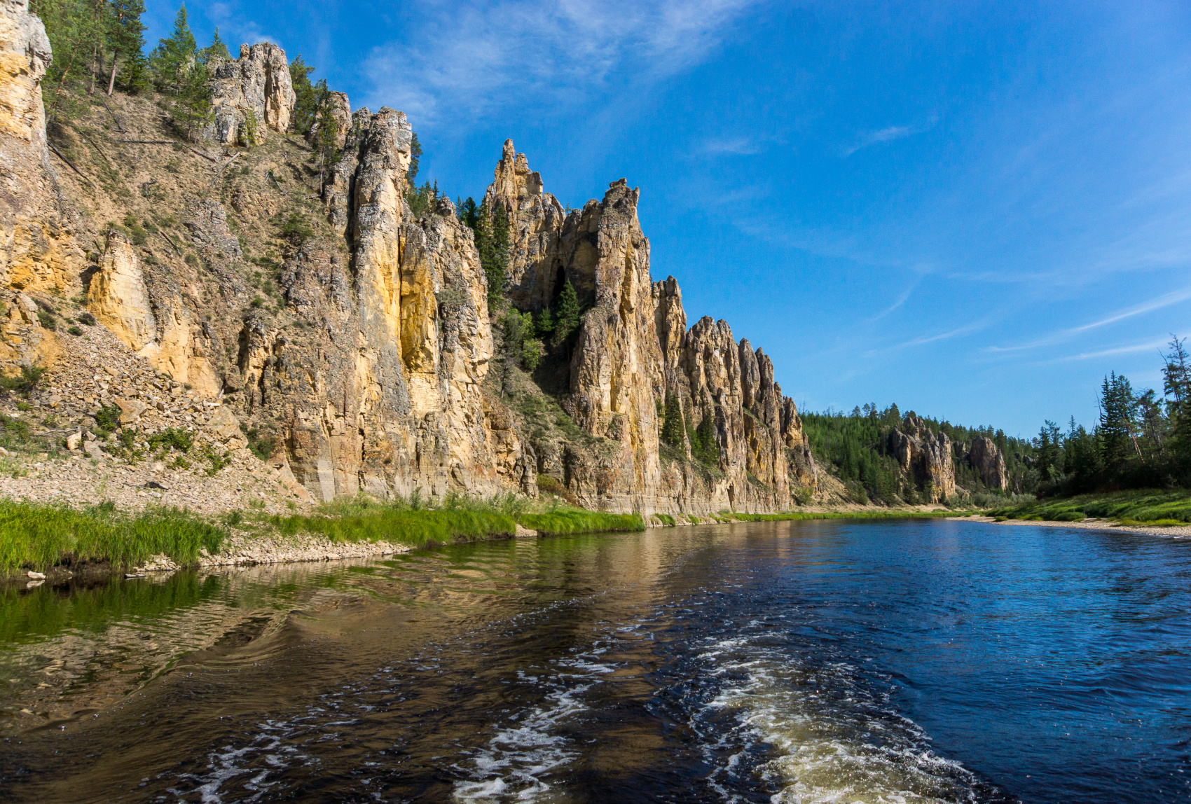 Речная прогулка до национального парка Ленские Столбы. Прибытие на Ленские столбы в районе устья Лабыдья.
