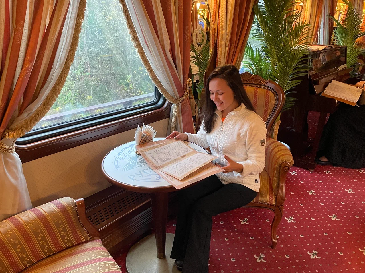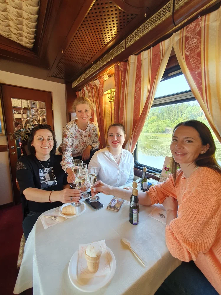После обеда и свободного времени в парке мы завершаем поездку особенно атмосферно — отправляемся на Ретропоезде в Сортавалу. Это не просто дорога обратно, а полноценная часть впечатления: настоящий паровоз, вагоны в стиле конца 19 века, красивый интерьер, живая музыка и ощущение, будто мы ненадолго переносимся в другую эпоху. Мы специально завершаем тур именно так, чтобы у вас осталось не чувство окончания поездки, а чувство красиво прожитой истории.