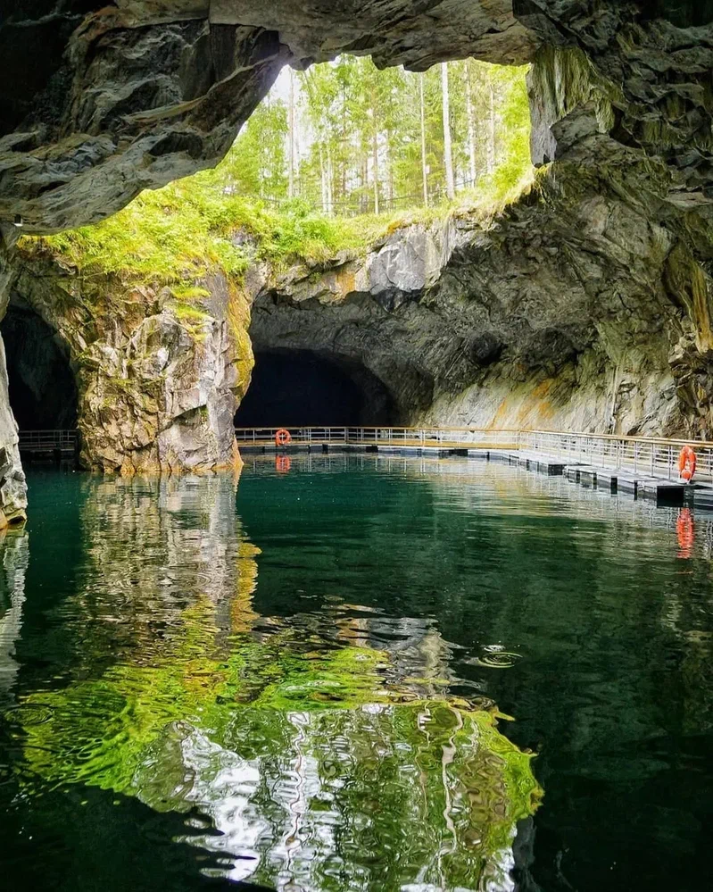 Дальше нас ждёт ещё одно сильное впечатление — Подземная Рускеала. Это место, куда попасть не так просто, и именно поэтому оно ощущается особенно ценным. Мы спустимся в бывшие мраморные выработки, увидим мистические гроты, игру света, воды и камня, и окажемся в пространстве, которое производит по-настоящему мощное впечатление. Это тот момент путешествия, когда хочется просто замолчать и смотреть по сторонам, потому что вокруг действительно очень красиво.
