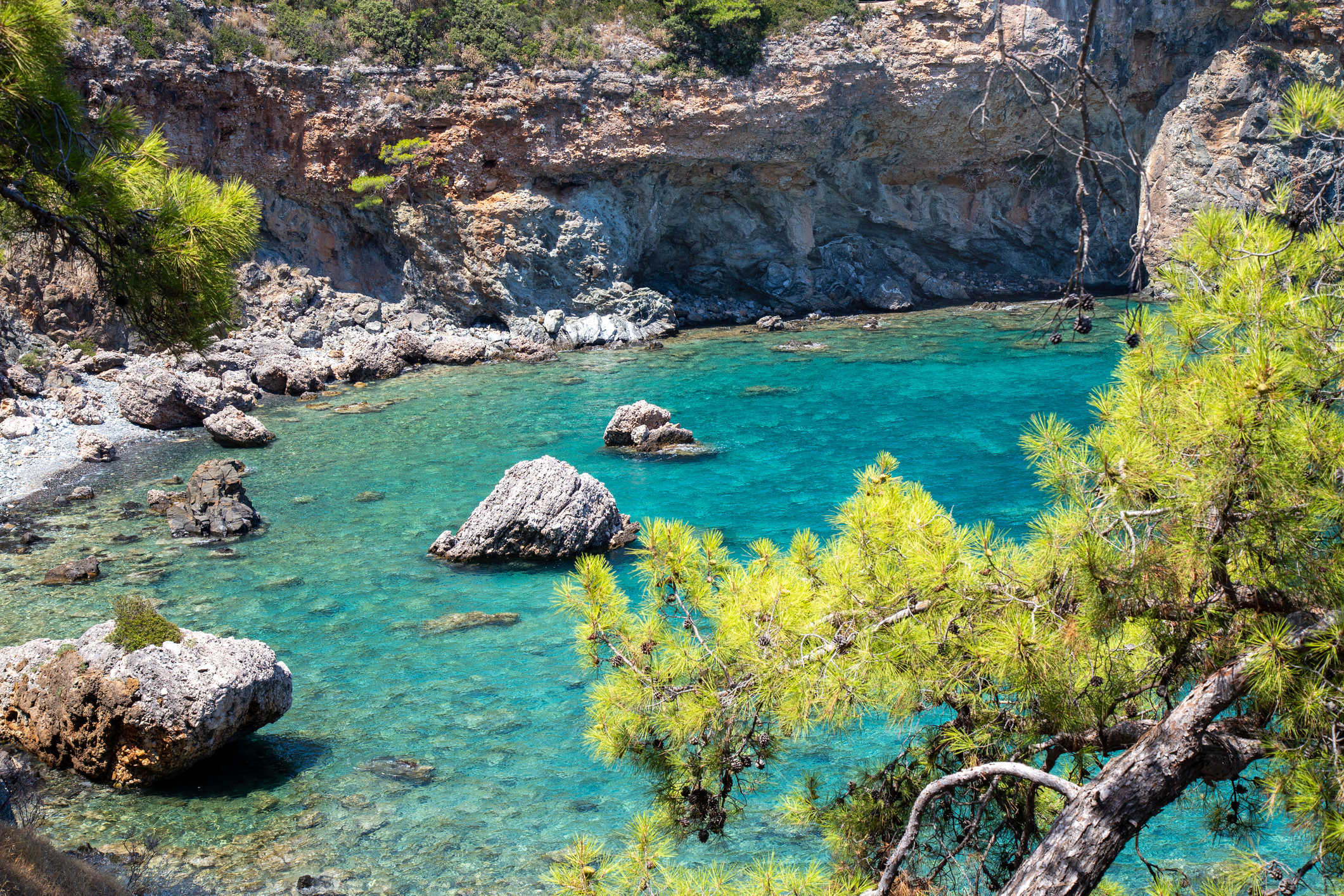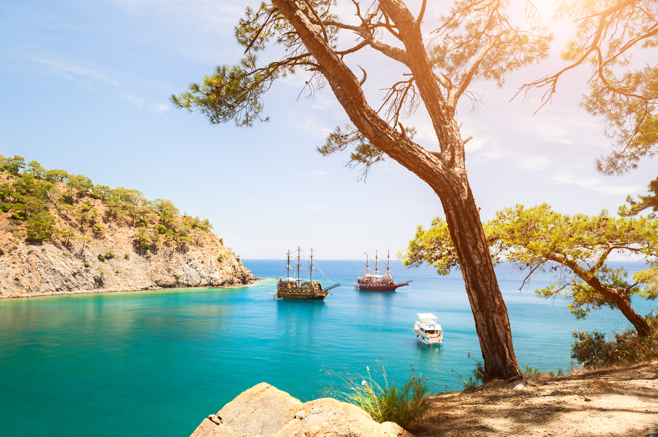 Первая остановка — Пиратская пещера, мрачноватый грот, где по преданию укрывались морские разбойники. Сквозь расщелины в сводах внутрь проникает солнечный свет, превращая воду в мерцающее изумрудное зеркало. Следом открывается Райская бухта — уютный уголок, окружённый соснами, где царит полная тишина, а море имеет удивительный бирюзовый оттенок. Здесь хочется задержаться подольше, наслаждаясь покоем.