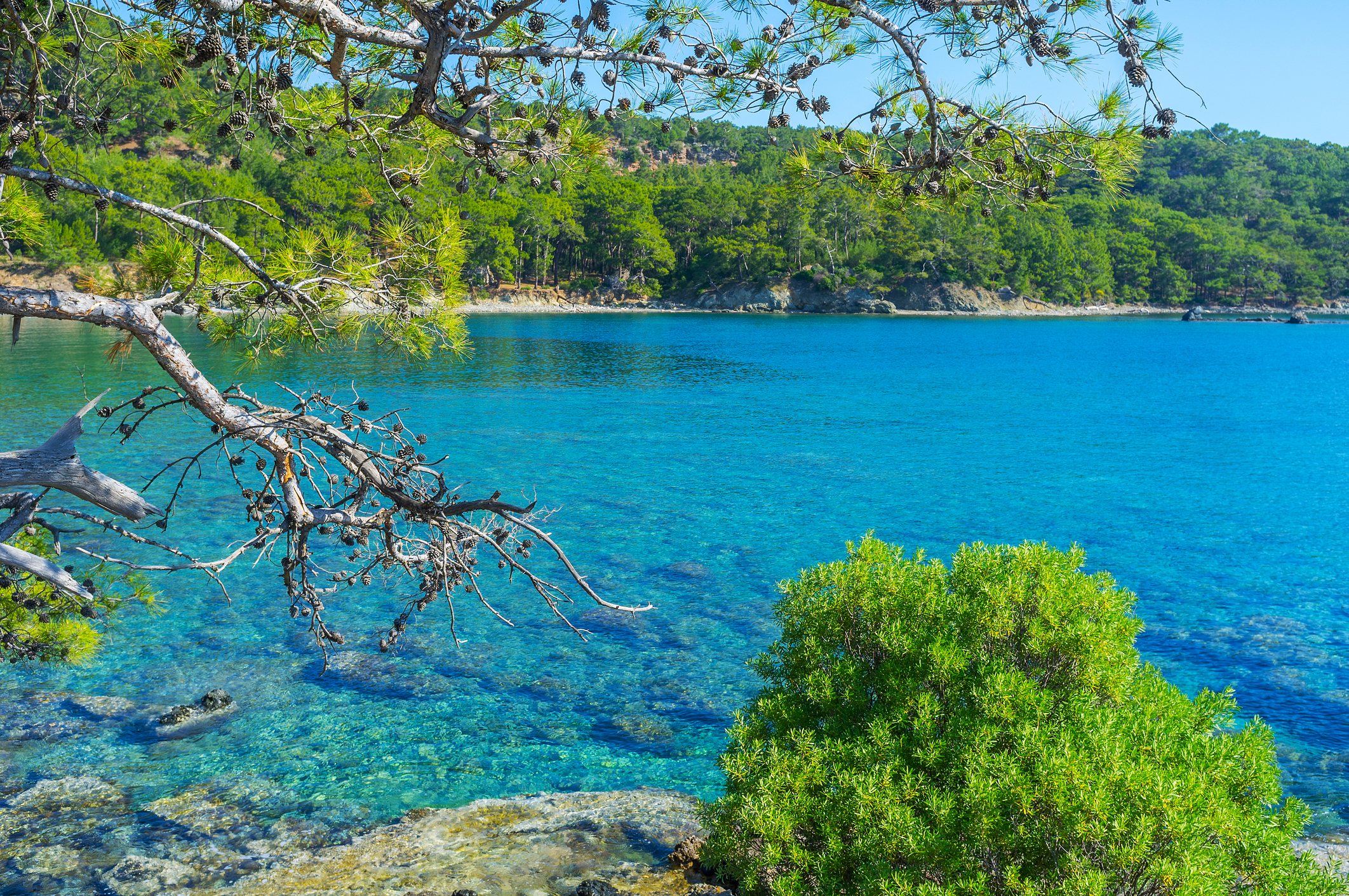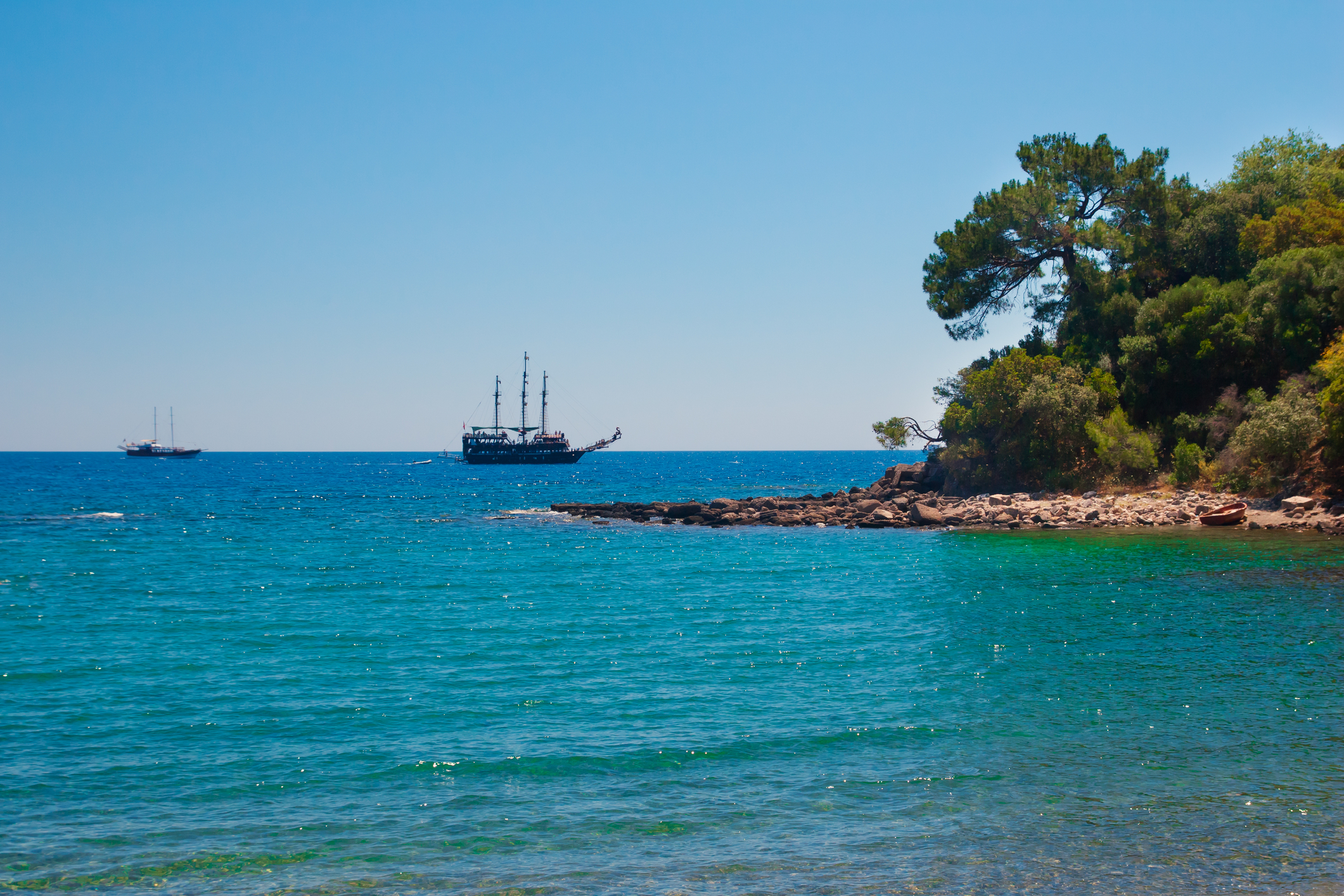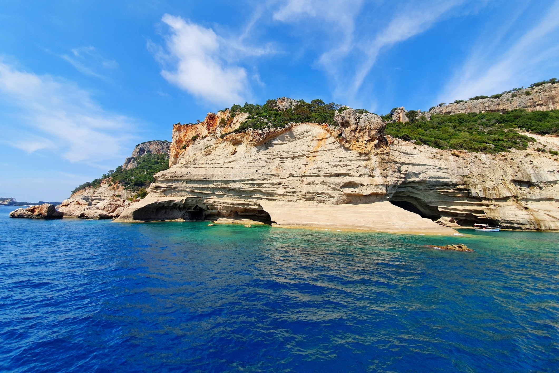 Четыре живописные точки маршрута: загадочный грот, где по легендам скрывались пираты; уютная сосновая бухта с тихой гладью; античная гавань Фаселис, окружённая древними руинами; а также укромное место с водой необычного бирюзово-молочного оттенка. На каждой остановке — около часа на заплывы, отдых у борта и наблюдение за подводным миром