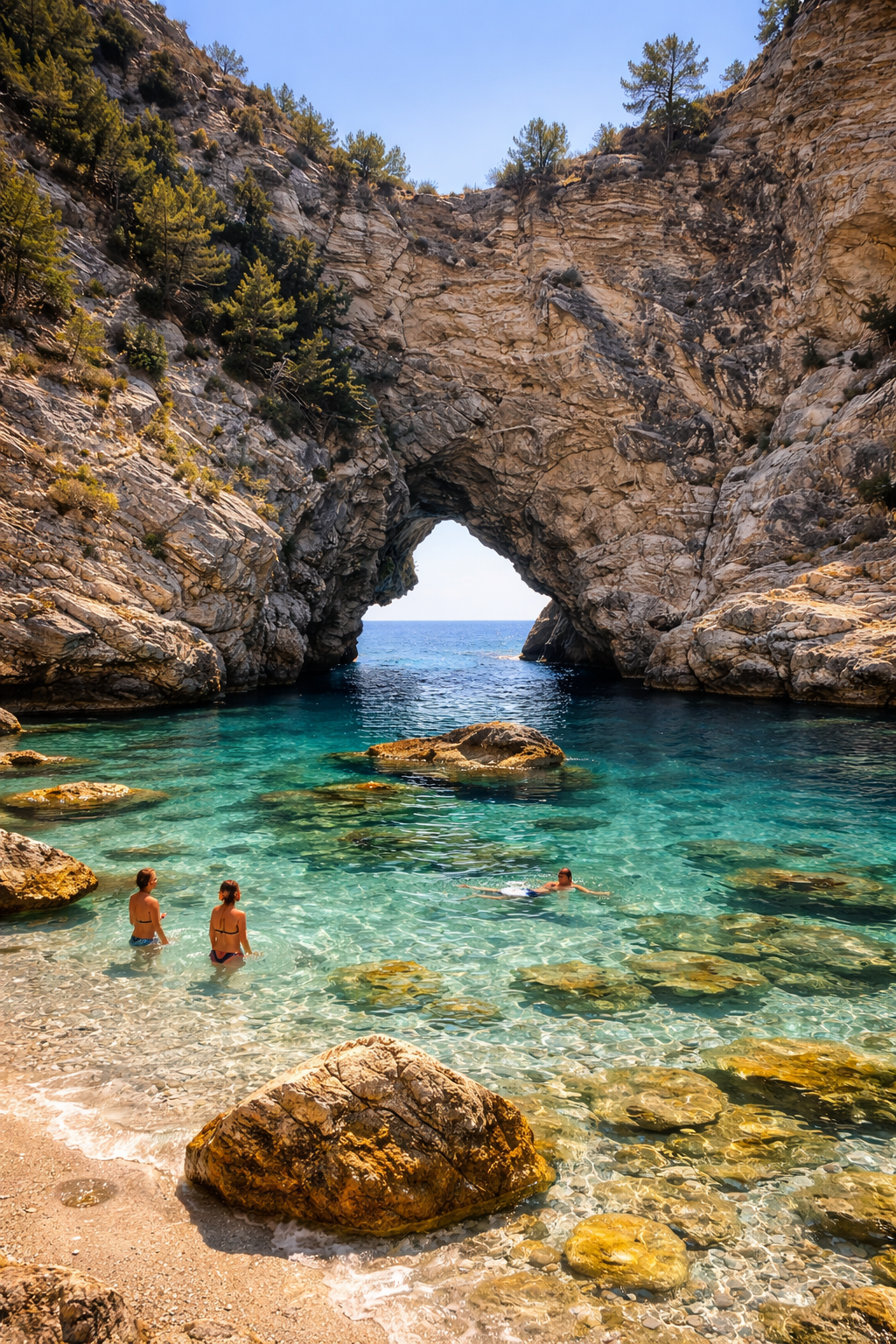 После руин — вниз, к воде. Такую бирюзу невозможно описать, ее можно только увидеть и замолчать. Именно такого цвета там море: не синее, не зеленое, а светящееся изнутри, живое. Мы оказались в полумраке скал, под сводами, где гулко капает вода и пахнет солью и вечностью. Это редкое ощущение — как будто земля впустила тебя в самое сокровенное, позволила прикоснуться к своей тайне.