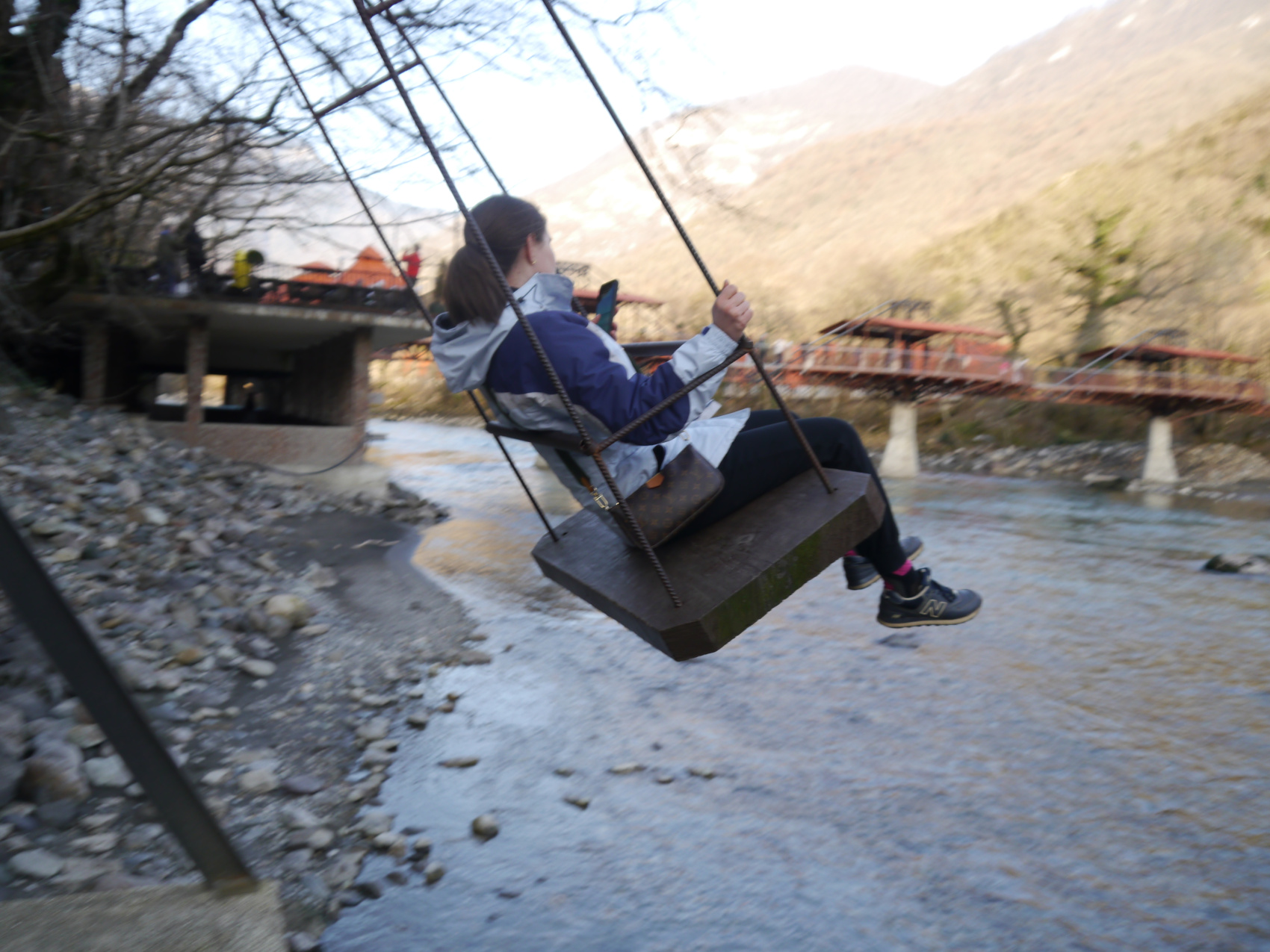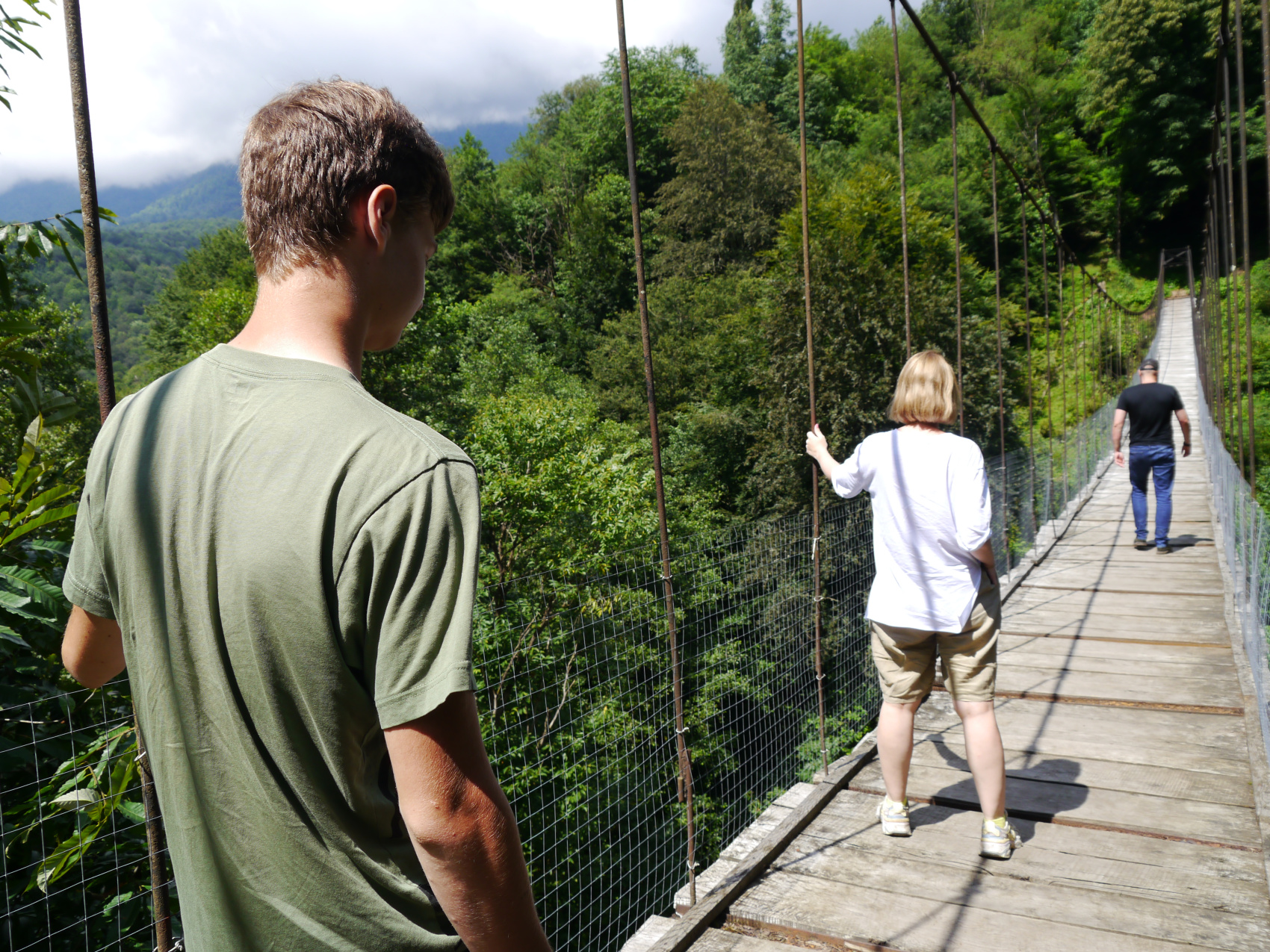 Первая достопримечательность на нашем пути - подвесной мост через горную реку Бзыбь. Ходить по нему даже не обязательно, если смотреть и фотографировать - уже впечатляет. Дальше нас ждёт загадочное Голубое озеро, вода которого имеет насыщенный малахитовый оттенок из-за его глубины.