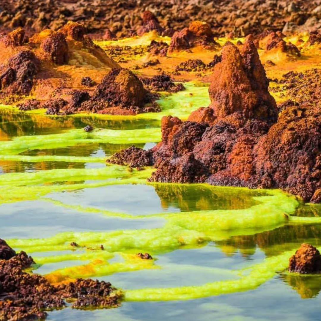 Ранним утром вы отправитесь в Даллол — самое жаркое населённое место Земли. Здесь вас встретит инопланетный пейзаж: кислотные гейзеры, фумаролы и озёра невероятных жёлтых, зелёных и оранжевых оттенков. Земля буквально дышит под ногами. После обеда вы покинете пустыню и отправитесь в сторону города Мекелле, где вас ждёт долгожданный душ, мягкая постель и возможность перевести дух перед новыми открытиями.