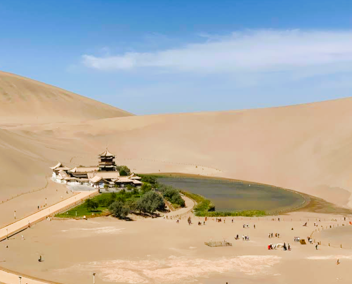 После обеда едем к дюнам Минша и озеру Полумесяца. Пески, ветер, свет — и ощущение пространства, в котором легко представить караваны, уходящие за горизонт.