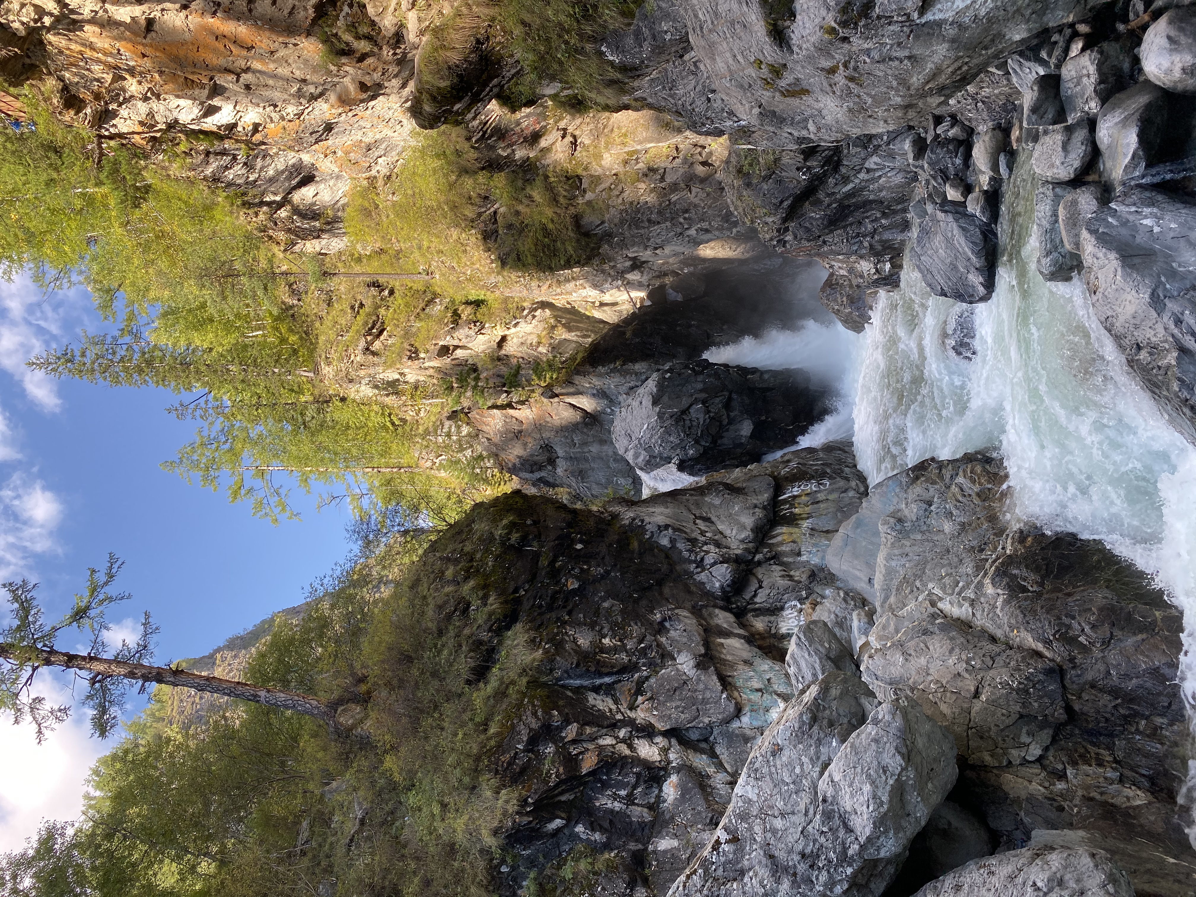 Первый водопад находится всего в 1,5 км от курорта Аршан. К нему ведет удобная тропа, проложенная вдоль левого берега реки. Выше по течению река образует ущелье, окруженное каменными стенами и причудливыми скальными образованиями. Особое внимание привлекает участок русла, известный как Мраморное дно, где вода отполировала желто-розовый мрамор до зеркального блеска.