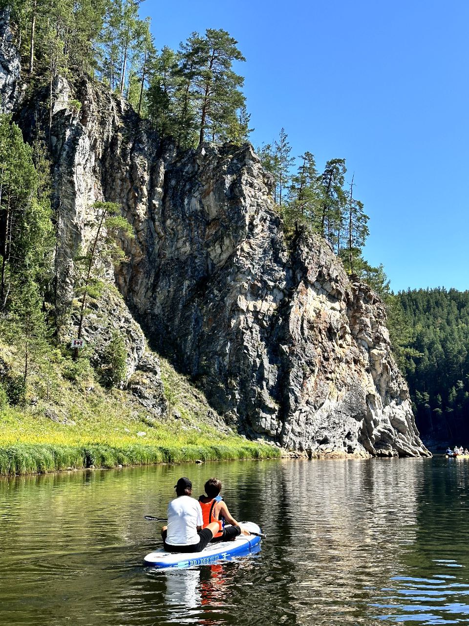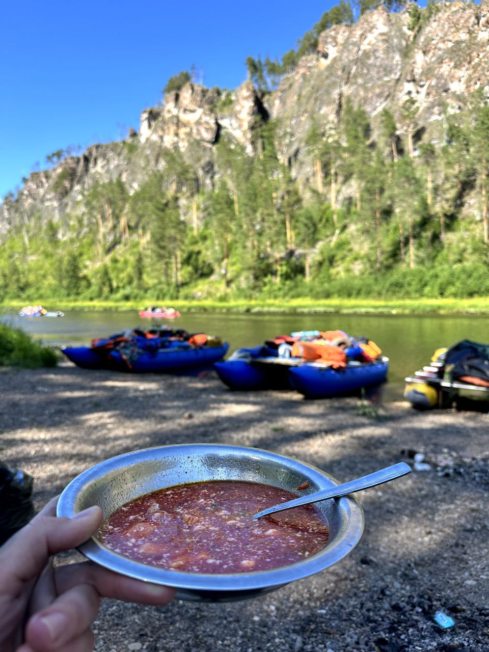 Сегодня у нас дневка. Это значит, что мы отдыхаем, наслаждаясь прекрасными видами, идем в походную баню, а желающие могут совершить подъем на камень Великан. Вечером обязательно соберемся у костра, чтобы поделиться впечатлениями и эмоциями от сплава.