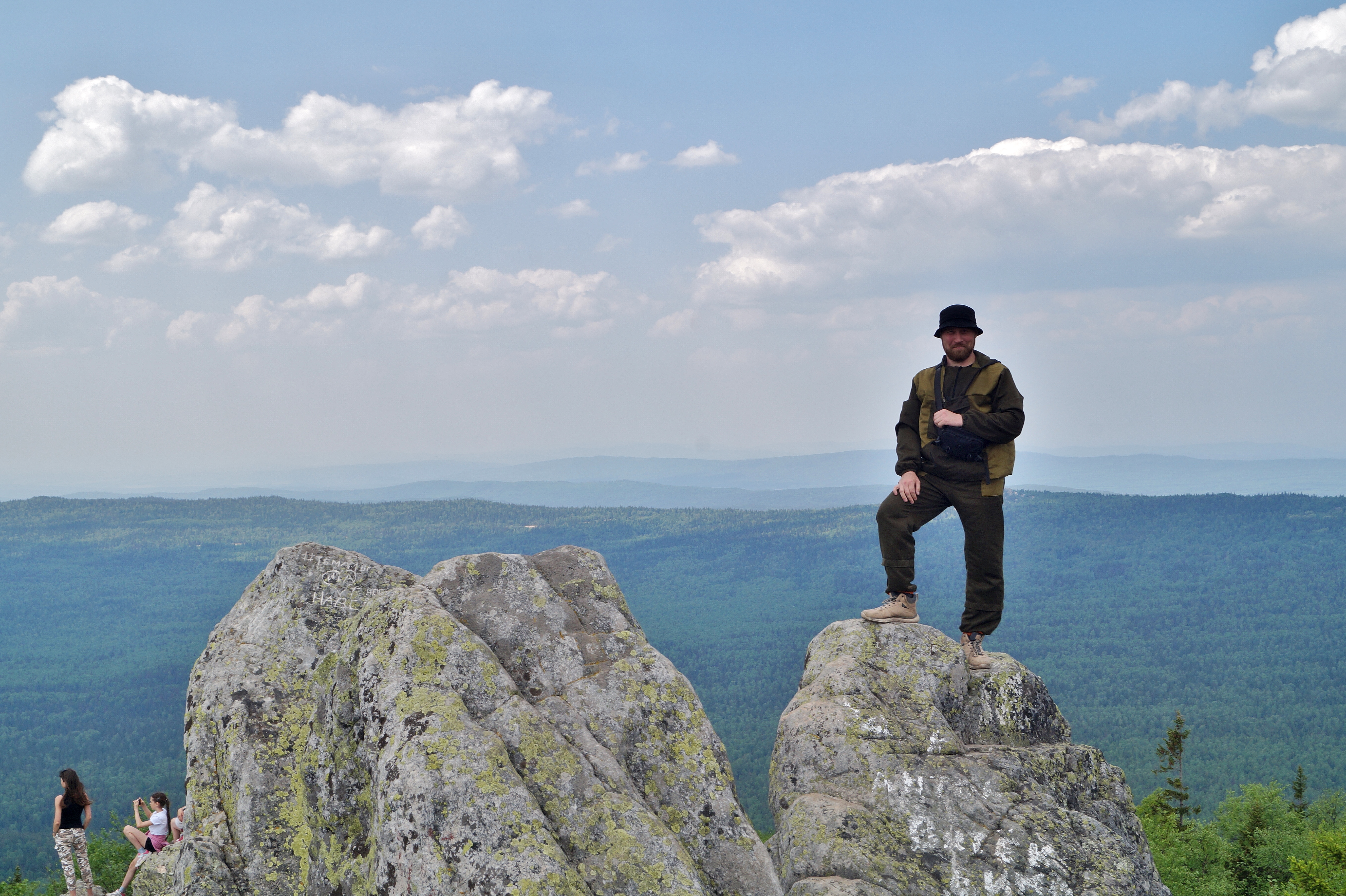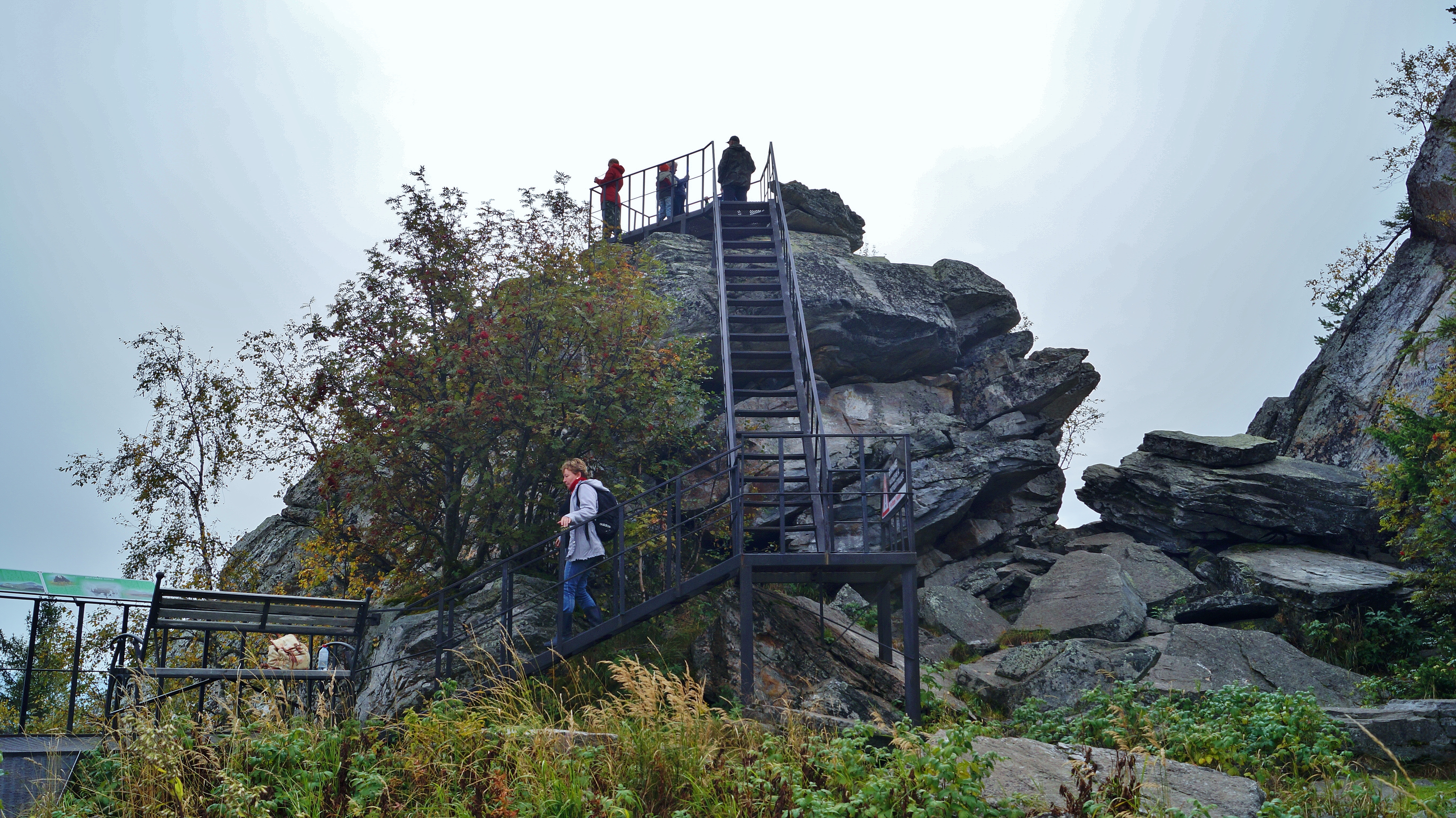 Немного отдохнув, по железной лестнице мы поднимаемся к южной вершине Двуглавой сопки, называемой Перья. В ясную погоду с вершины видны Златоуст и Айское водохранилище. С Перьев открывается прекрасная панорама на Откликной гребень и Дальний Таганай.