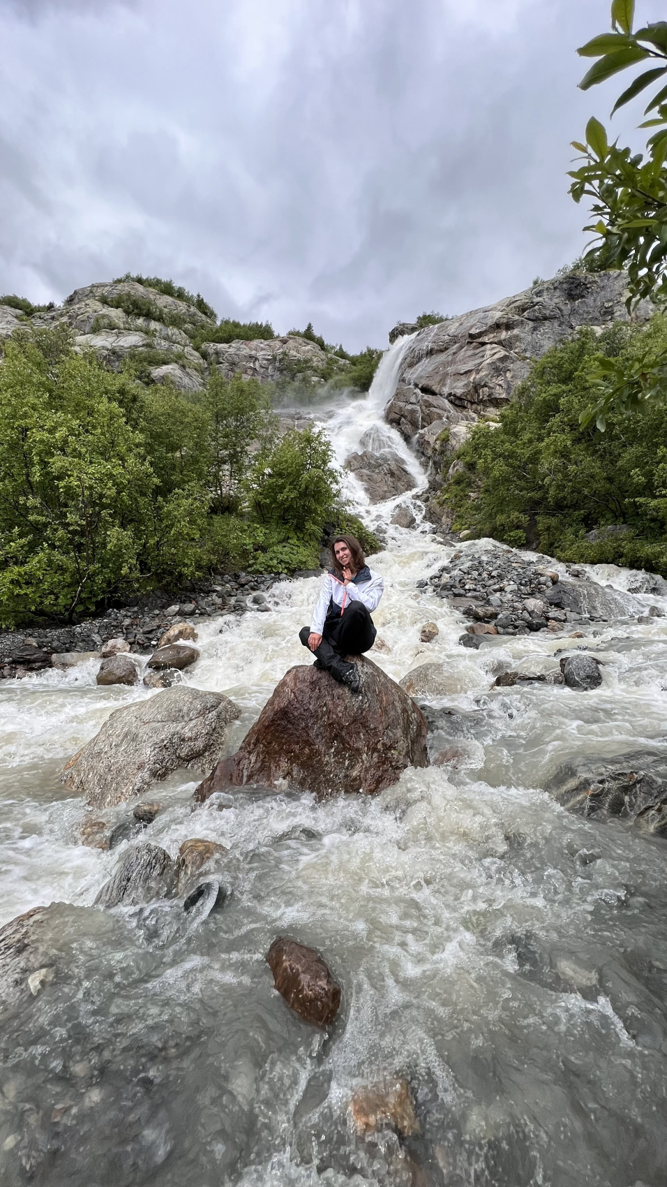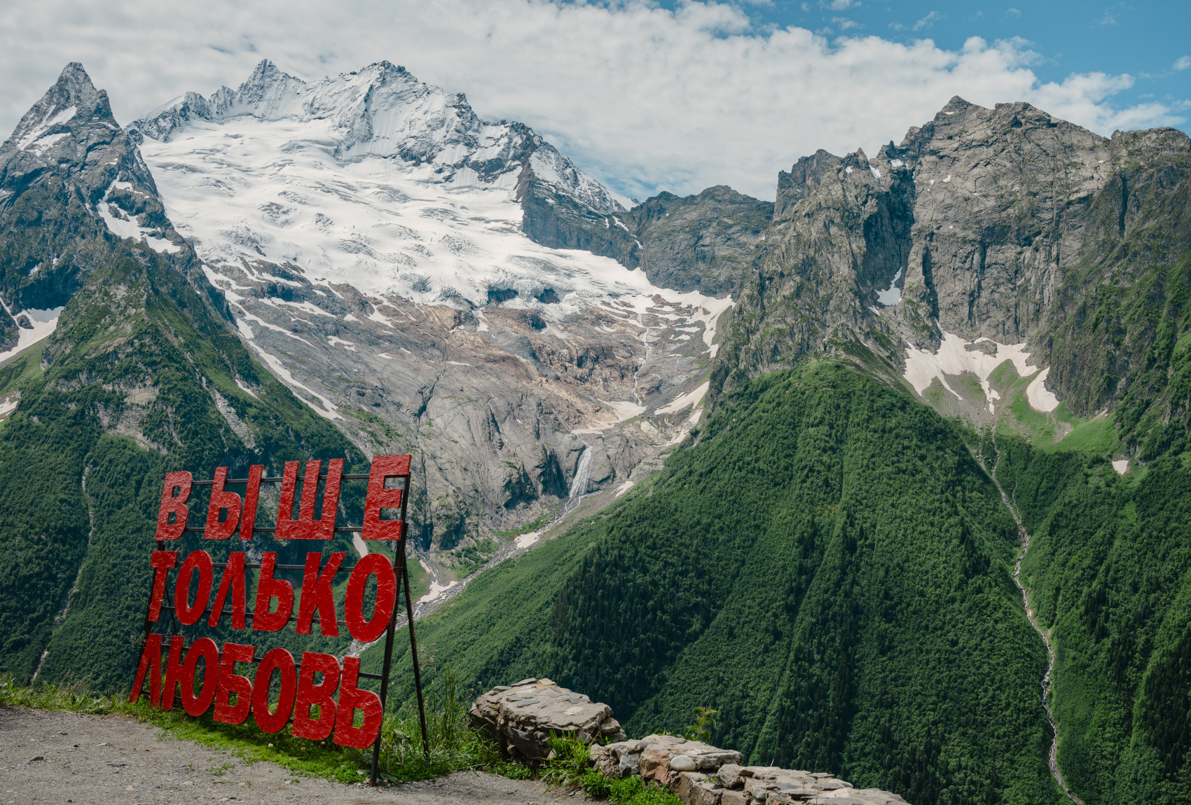 Путь к водопаду начинается от цветущих альпийских лугов и проходит по ущелью реки Алибек. На фоне всю зелень леса украшает белоснежный ледник. Подойдя к водопаду вы будете поражено мощью водных потоков, которые срываются с высоты 25 м. Примечательно то, что ещё в начале XX века водопад был скрыт под толщью ледника, и тем из-за активного таяния он нам открылся.