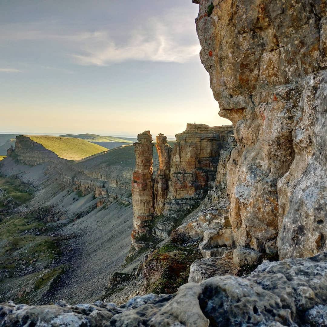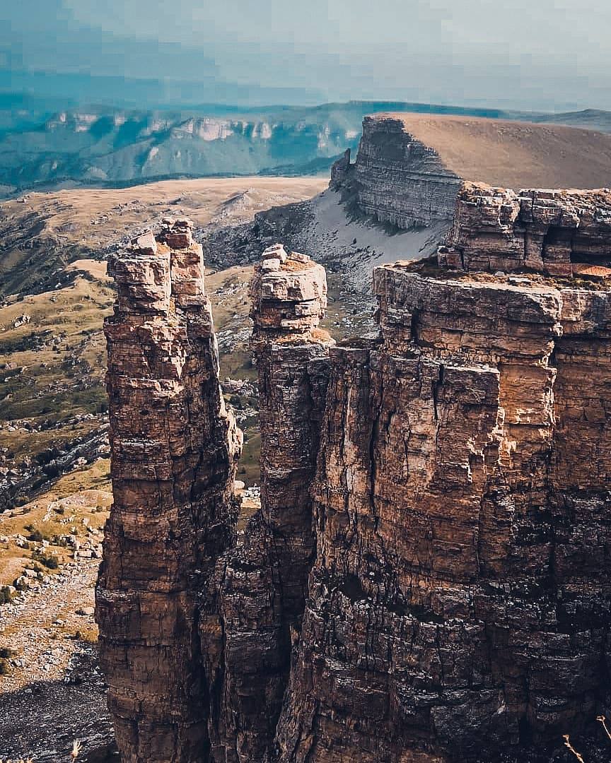 Кавказский Гранд-Каньон. С плато открывается самый известный и эффектный вид на двуглавый Эльбрус. Отвесные скалы уходят вниз на сотни метров, открывая панорамы на долины рек и отдаленные хребты .