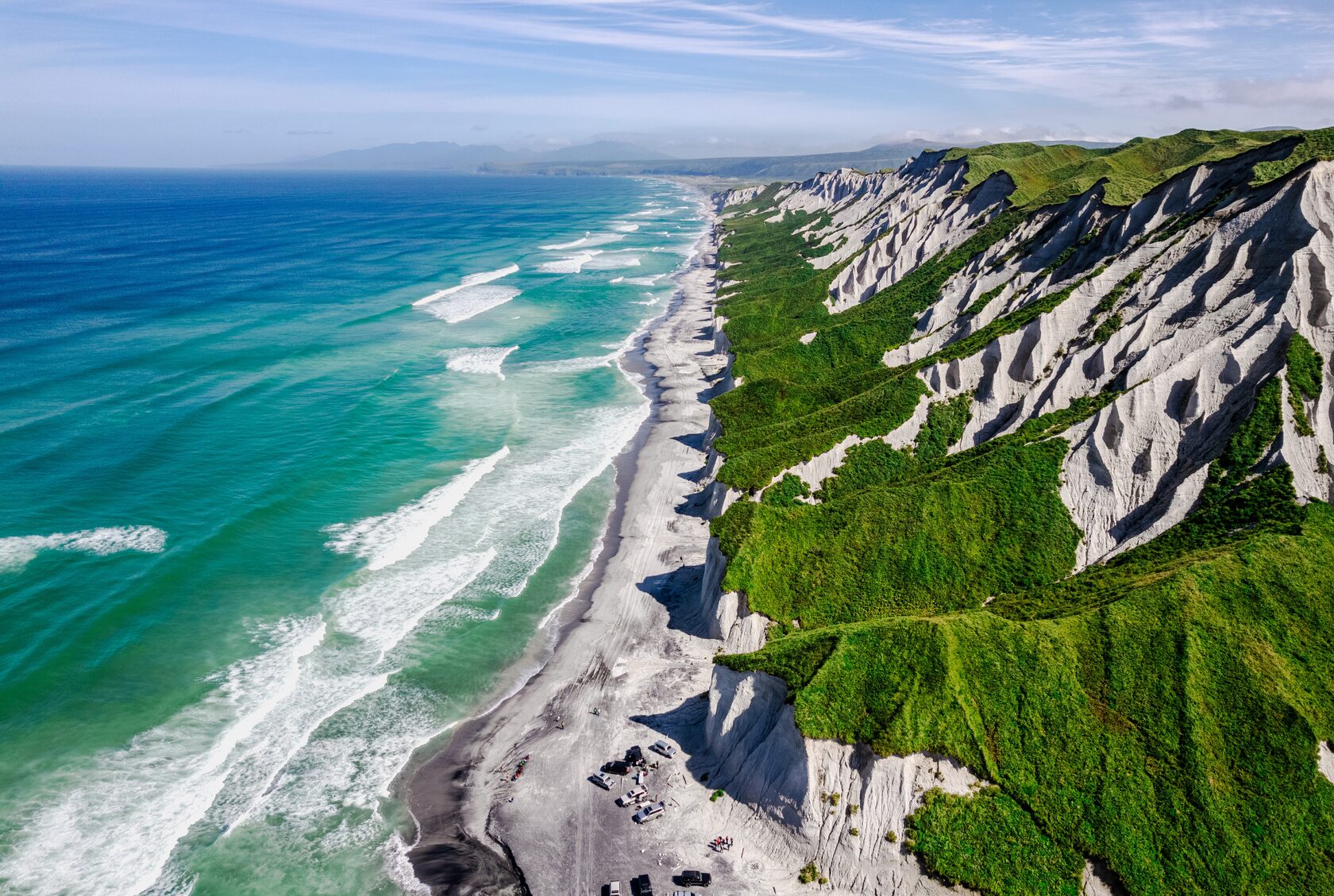 Сегодня увидим знаковые места острова — Черные скалы и базальтовые колонны, и главную жемчужину — Белые скалы. До локаций едем прямо по белоснежной кроме песка вдоль берега Охотского моря. Ветер, чайки, брызги и чистый драйв! На Белых скалах совершим короткий трекинг вверх по тропе, чтобы полюбоваться местом с высоты и сделать эффектные фото. Доедем до бухты Парусная, где прогуляемся на водопад Девичьи слезы. Организуем пикник в видовой локации на берегу. Съедим свой боул с креветкой с видом на вулканы!