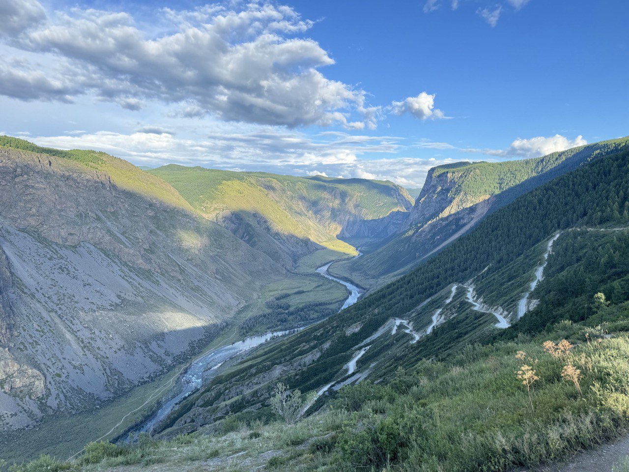 Во второй день нашего путешествия мы поедем в один из самых зрелищных уголков Алтая - Чулышманскую долину с кульминацией у водопада Куркуре. Экскурсия сочетает автомобильную часть (спуск с перевала Кату-Ярык) и пешую прогулку к водопаду (3 км. в одну сторону по прямой тропе). По дороге увидим Красные ворота - скалы красно-рыжеватого оттенка в месте встречи двух хребтов Курайского и Айгулакского, многочисленные озера, в том числе озеро Кеделю. Далее сделаем остановку на перевале Кату-Ярык (1200 с. над уровне моря). Смотровая площадка на вершине открывает панораму каньона: отвесные скалы, извилистая река Чулышман и горные хребты. В долину Чулышмана спустимся по серпантинной дороге с 9 поворотами и уклоном 35о.
