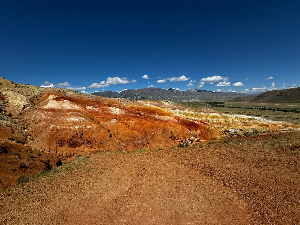 Далее поедем в долину Кызыл-Чин, где находится уникальный природный объект, известный как Алтайский Марс. Здесь увидим причудливые красные и жёлтые холмы, создающие впечатление, что мы находимся на другой планете. Это место завораживает своими необычными формами и цветами, и вы сможете сделать множество незабываемых фотографий. После обеда в уютном кафе пешком прогуляемся до ещё одного марса - Марс-2. Этот уникальный природный объект условно названный Марс-2 представляет собой склон, где застыли цветные слои осадочных пород (с примесью железа, которые придают склону разноцветную палитру.
