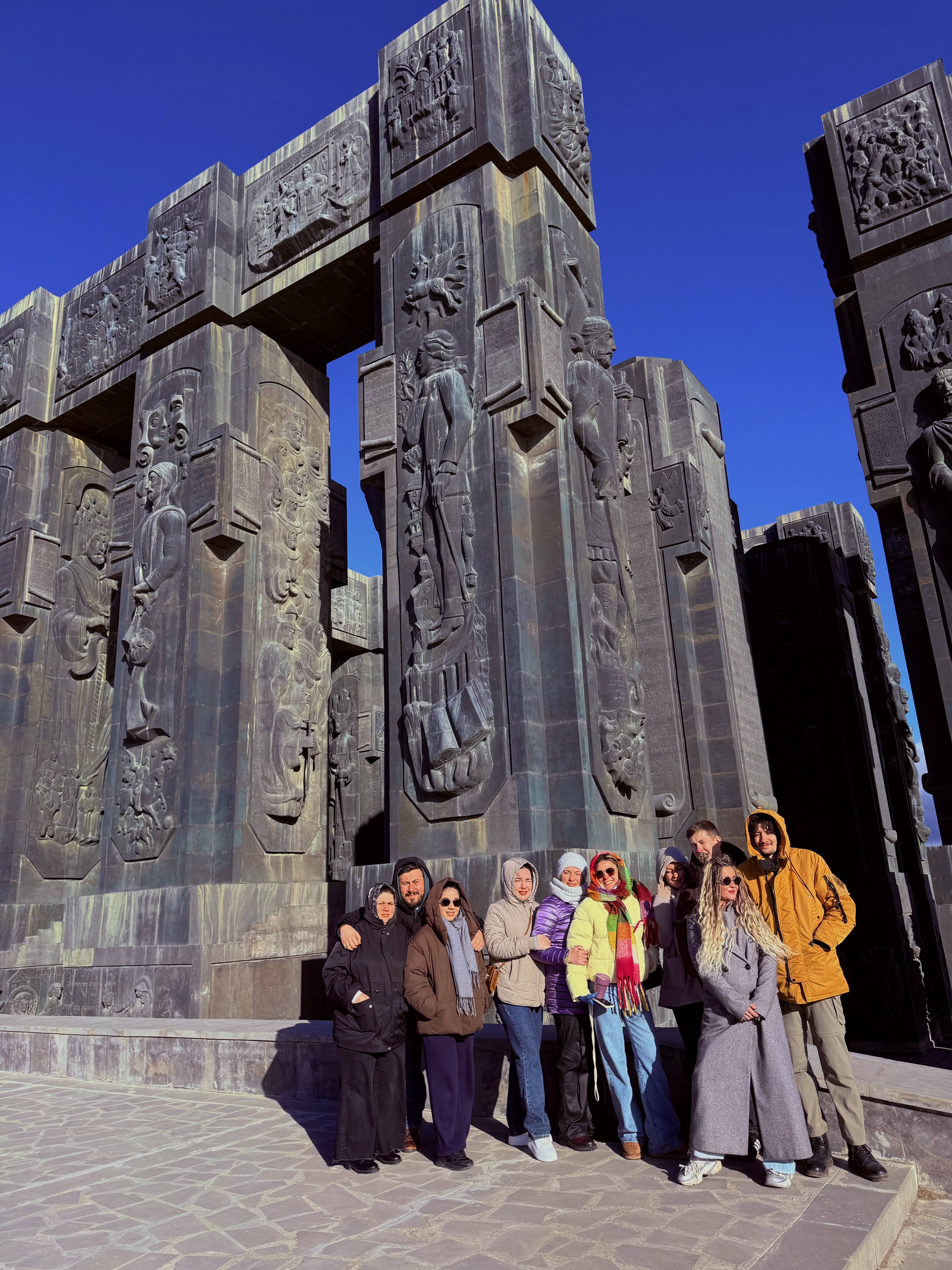 Начинаем с места, которое редко попадает в стандартные маршруты, но поражает с первого взгляда. Монументальный ансамбль Зураба Церетели — Летопись Грузии: гигантские колонны с барельефами царей, святых и героев, история страны, высеченная в камне. Здесь чувствуешь масштаб, глубину и характер Грузии. Бонус — захватывающий вид на Тбилисское море.