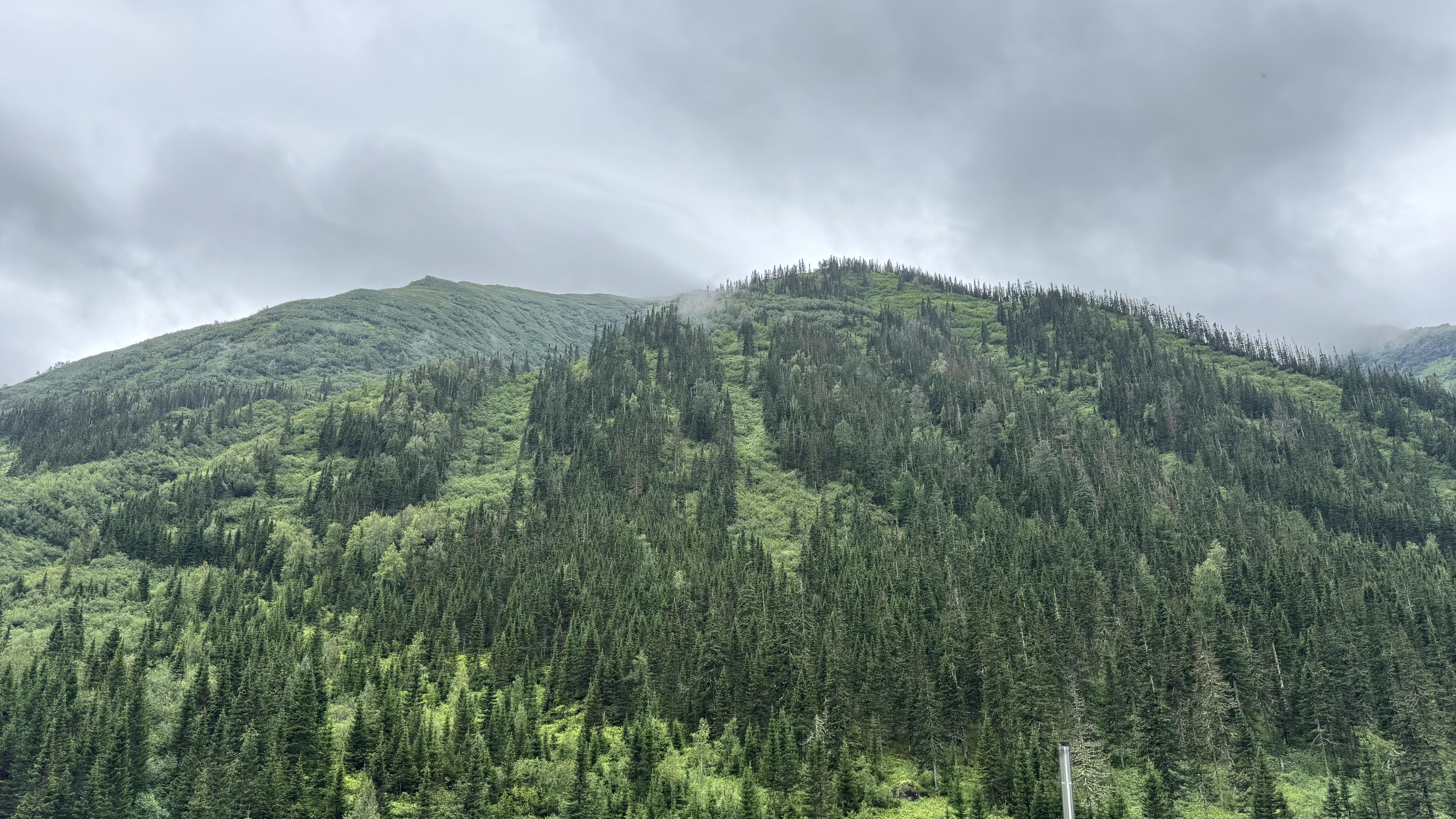 Возвращаемся в отель, собираемся. Выезд из гостиницы - и снова прыгаем в вездеходы. Теперь вниз. Спуск с горы Мамай - это отдельное приключение: колёса скользят по грунту, тайга расступается, а в щелях между деревьями мелькают далёкие дали.