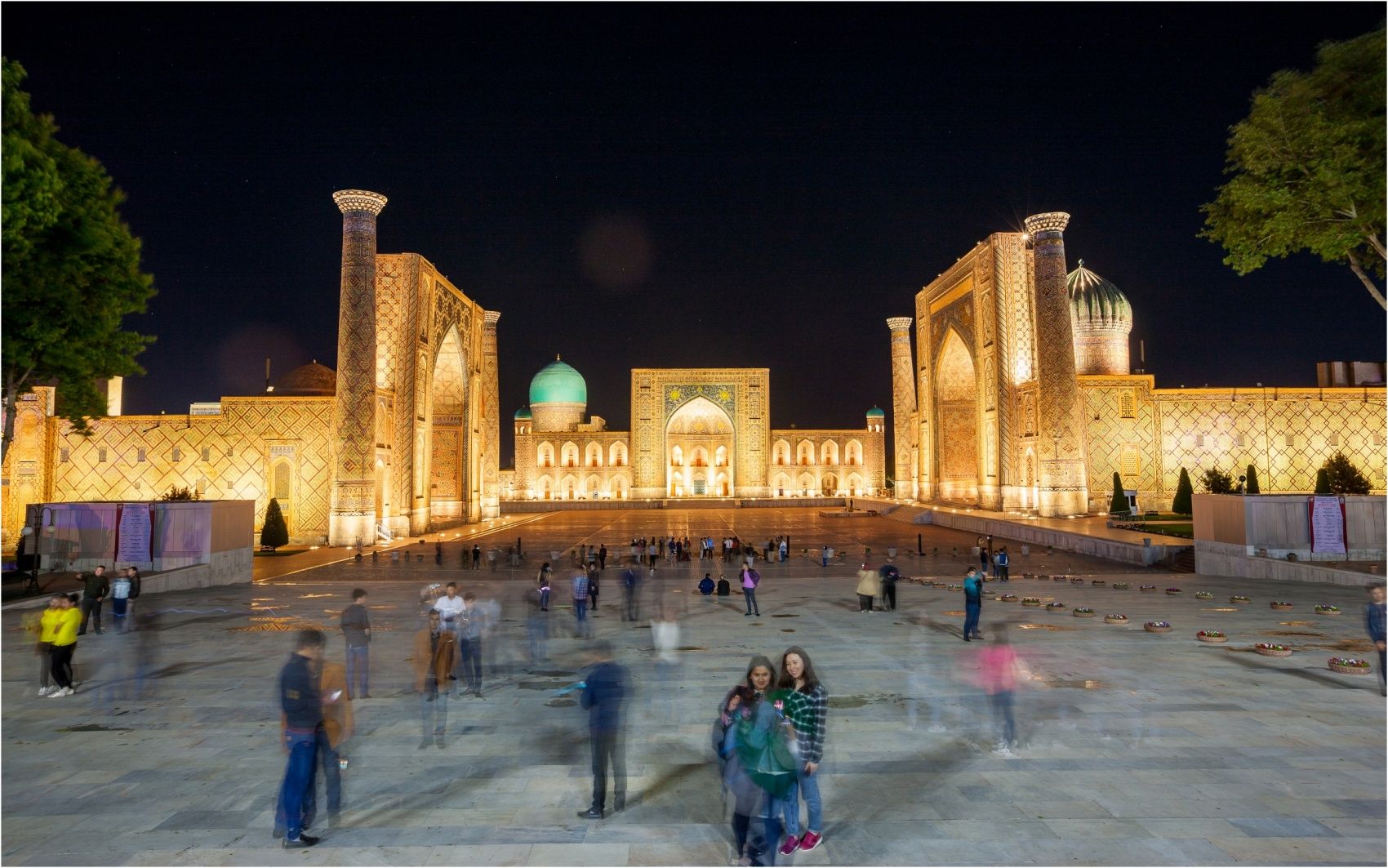 Началом экскурсий закономерно станет исторический район города под названием Регистан — площадь в Самарканде, дословно переводится как место, покрытое песком. Регистан располагает на себе 3 исторические медресе, которые датируются 15-17 веками и считаются ярким примером персидской архитектуры. Медресе это мусульманское учебное заведение, объединяющие в себе и светское образование и духовное.