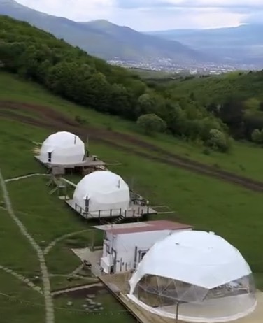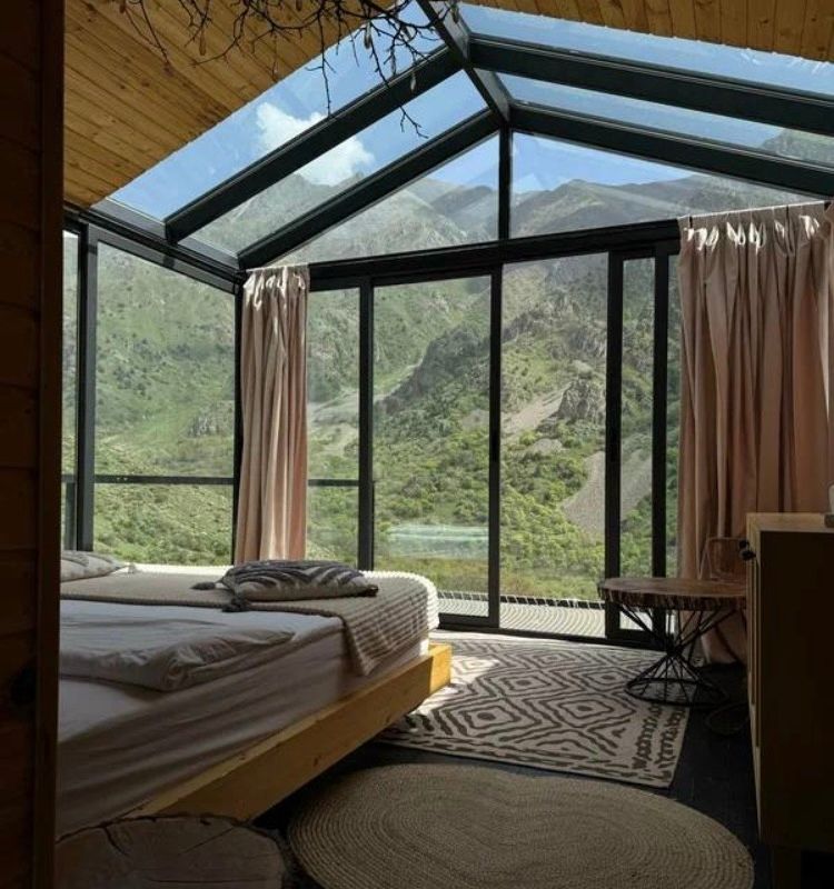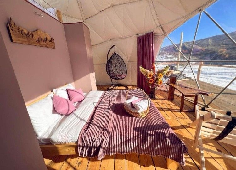 Вечером заселяемся в глэмпинг в горах и отдыхаем. Можем строить атмосферный кинопоказ на проекторе, пожарить мясо в костровой зоне, а можем сходить в ресторан, послушать живую музыку и потанцевать!