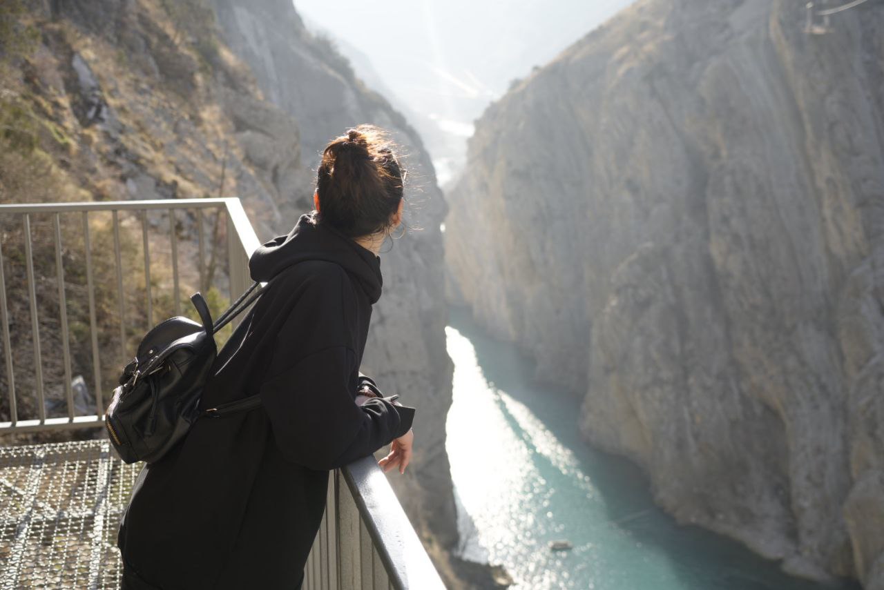 Сулакский каньон - достопримечательность всемирного масштаба. Чтобы увидеть его мы выбрали самую живописную и запоминающуюся смотровую площадку. Путь лежит через горную пещеру, протяженностью несколько десятков метров. Настоящим искателям впечатлений откроется бескрайняя речная долина с изумрудной водой и навесной мост, соединяющий две скалы, возвышающихся над Сулакским каньоном. Завораживает цвет воды, больше напоминающий воды тропических морских курортов. И это на фоне фантастически красивых горных пейзажей.