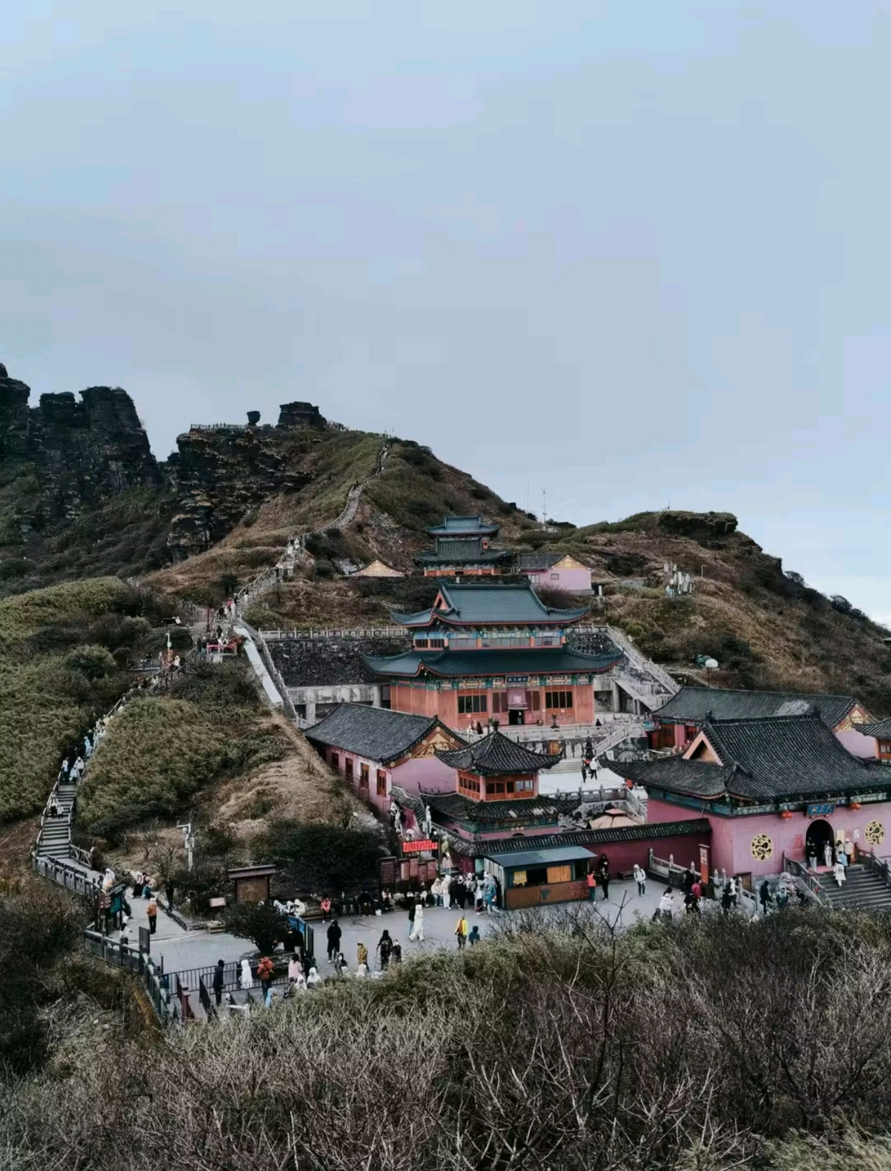 Сегодня утром мы по канатной дороге поднимемся на самый сложный участок — Вершину Красного Облака (Хунъюнь Цзиньдин). Это два пика, разделенные пропастью и соединенные мостом, на каждом из которых стоит по храму.
