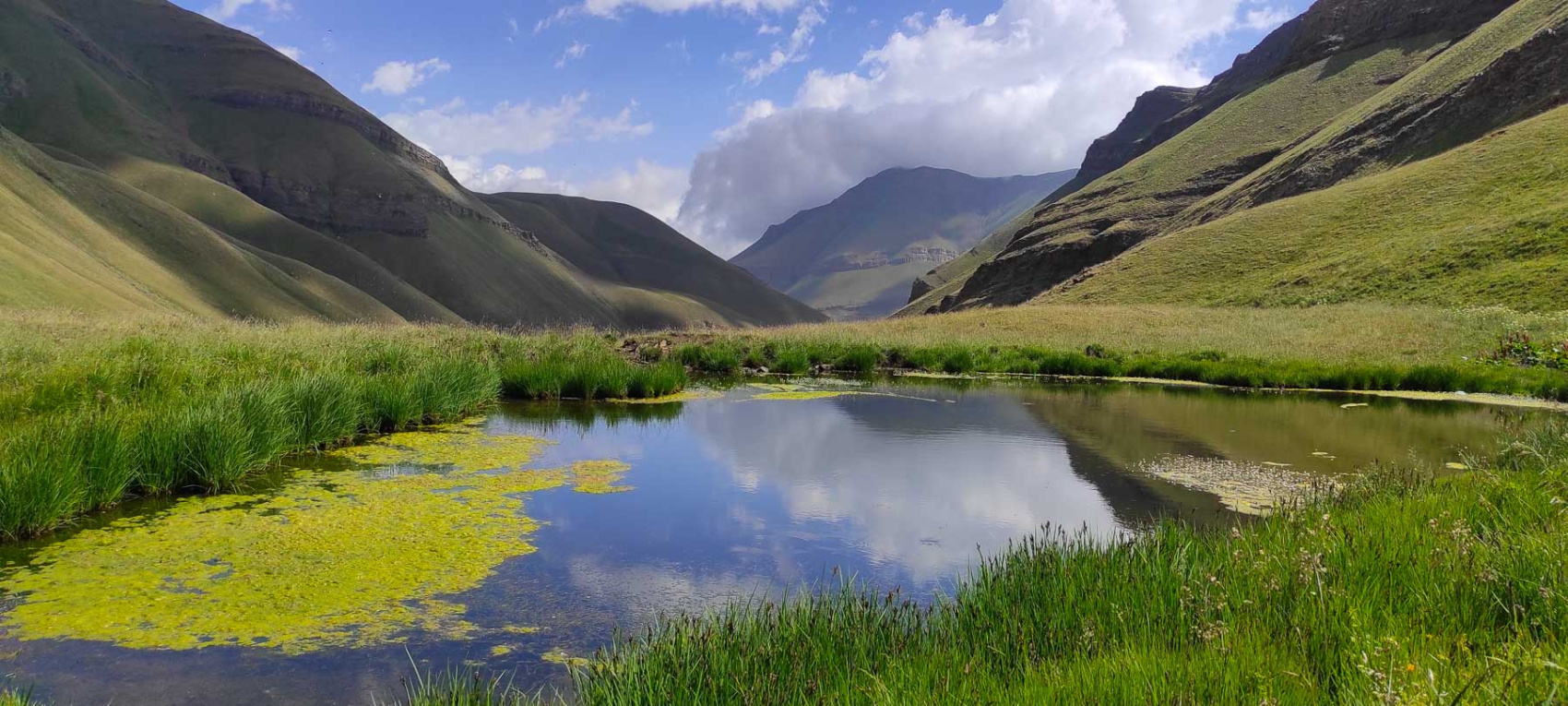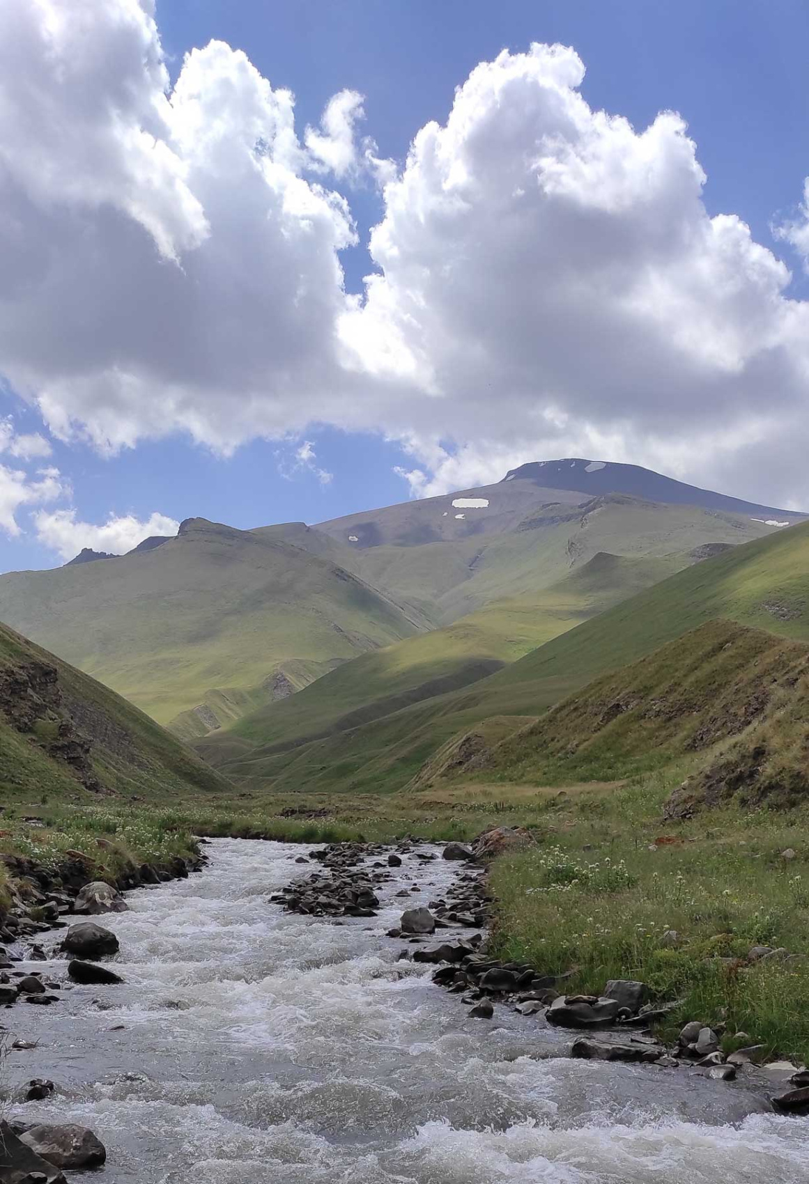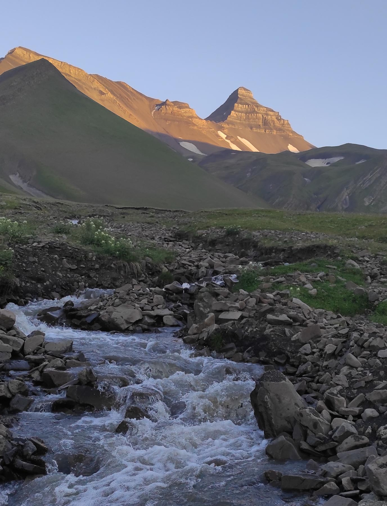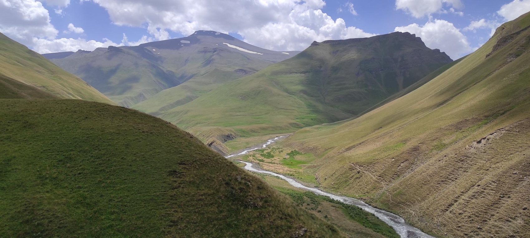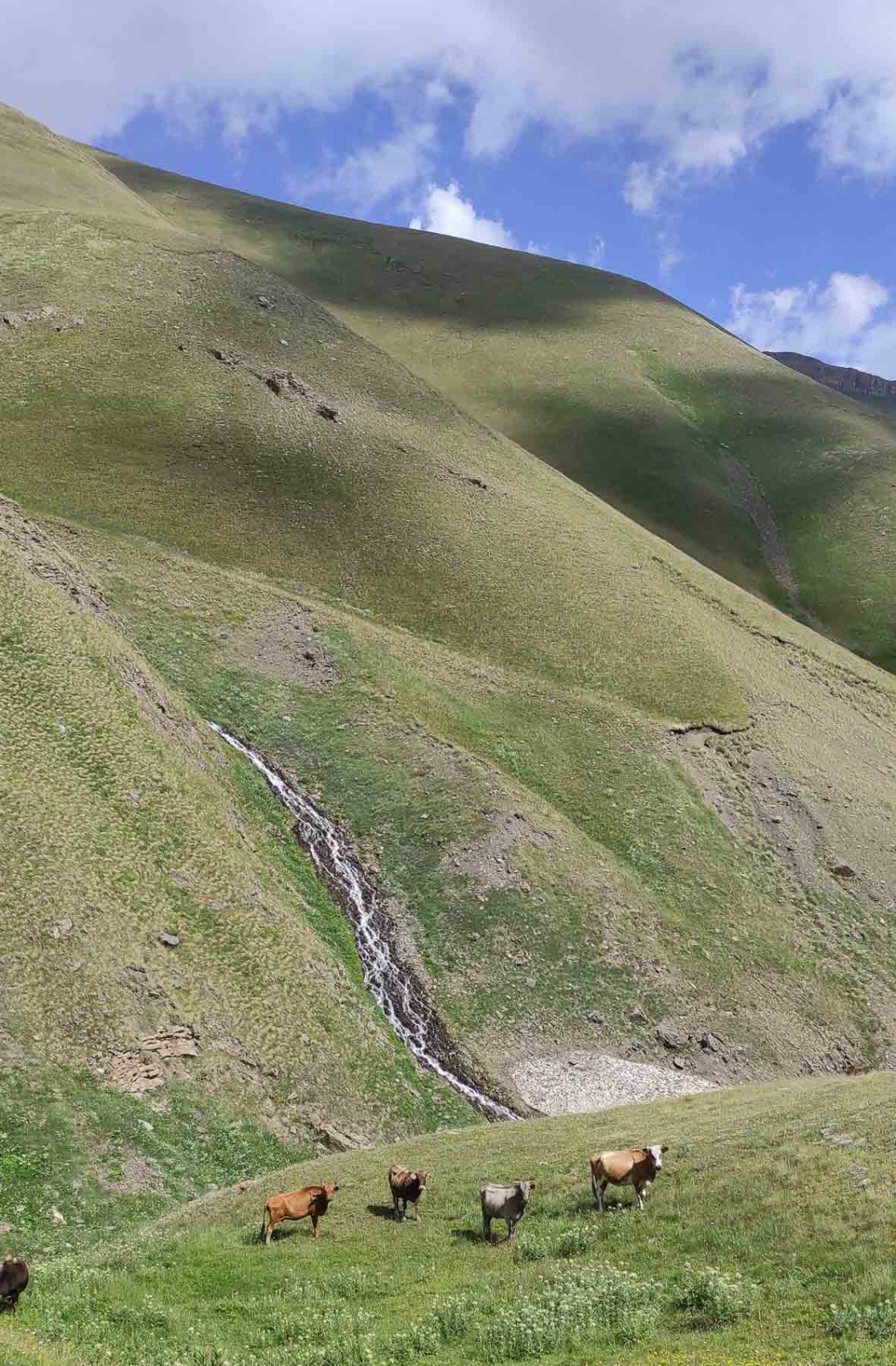 Выгружаемся из машины, забираем свои личные вещи и отправляемся в горы! Нас ждет перевал в другое ущелье и можно назвать этот день нашим первым акклиматизационным выходом. В пути у нас будет много зелени и пологие склоны, настоящие альпийские луга.