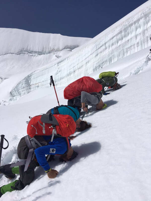 Сегодня у нас тренировка на снегу и льду. Мы получим и настроим все альпинистское снаряжение. Потом мы отработаем технику хождения в кошках, в связках, само задержание на леднике, работу с веревками.