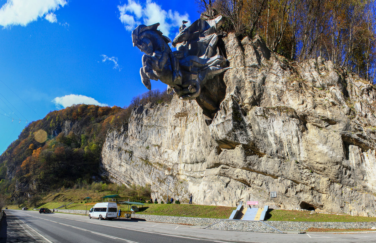 Двигаясь по Военно-Осетинской дороге в Алагирском ущелье, справа по ходу движения, внимание привлекает необычайная скульптурная композиция. Это Ныхас Уастырджи, как называют его в Осетии. Это место является дзуаром - святым местом. Скульптура крепится к скале и весит 28 тонн! Святилище и наскальный монумент Уастырджи. В осетинской традиции Георгий Победоносец носит имя Уастырджи, который также является одним из главных героев Нартского эпоса. Уастырджи - покровитель мужчин, путников и воинов. Монумент считается одним из самых больших конных памятников в мире.