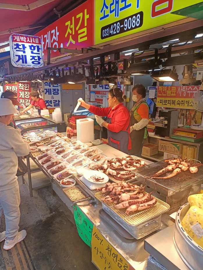Ужин на крупнейшем рыбном рынке. Покупка свежих морепродуктов и их моментальное приготовление на втором этаже в сопровождении традиционных корейских закусок.