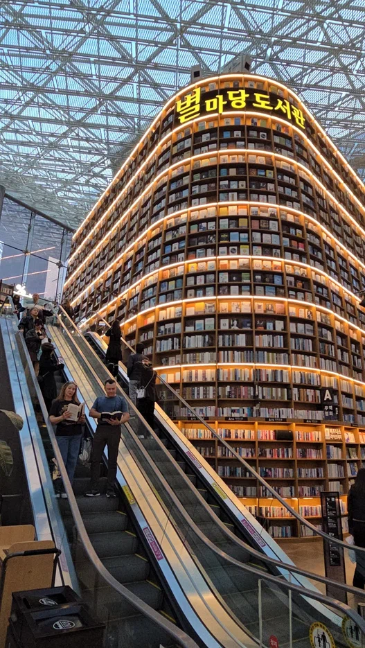 Посещение футуристической библиотеки Starfield с 13-метровыми книжными стеллажами.