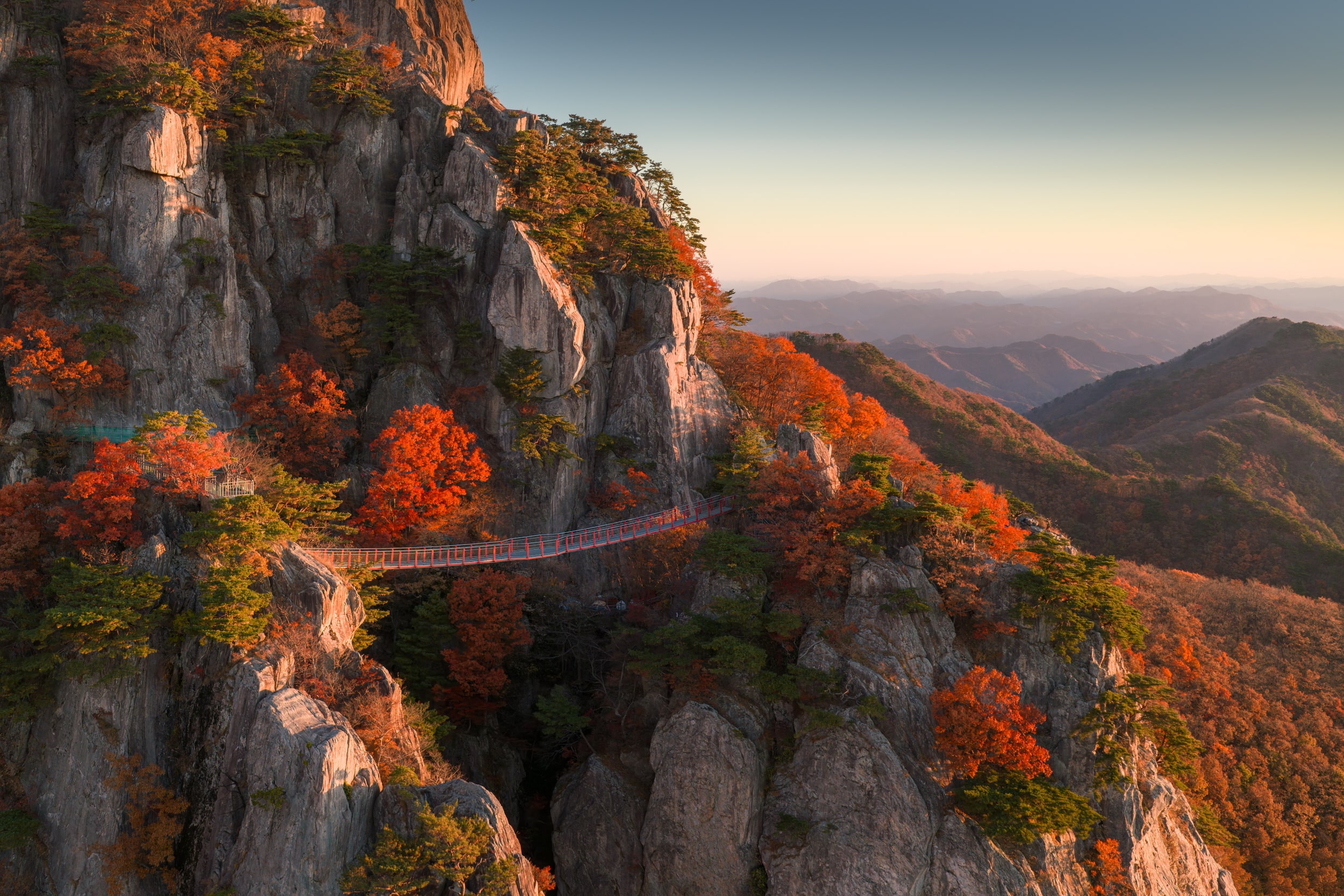 6:00 - 6.30 Ранним утром мы отправимся на микроавтобусе к одному из самых живописных горных массивов Южной Кореи — Daedunsan. Уже в 10:00 мы поднимемся на канатной дороге к началу пешего маршрута — и отсюда начнётся настоящее приключение.