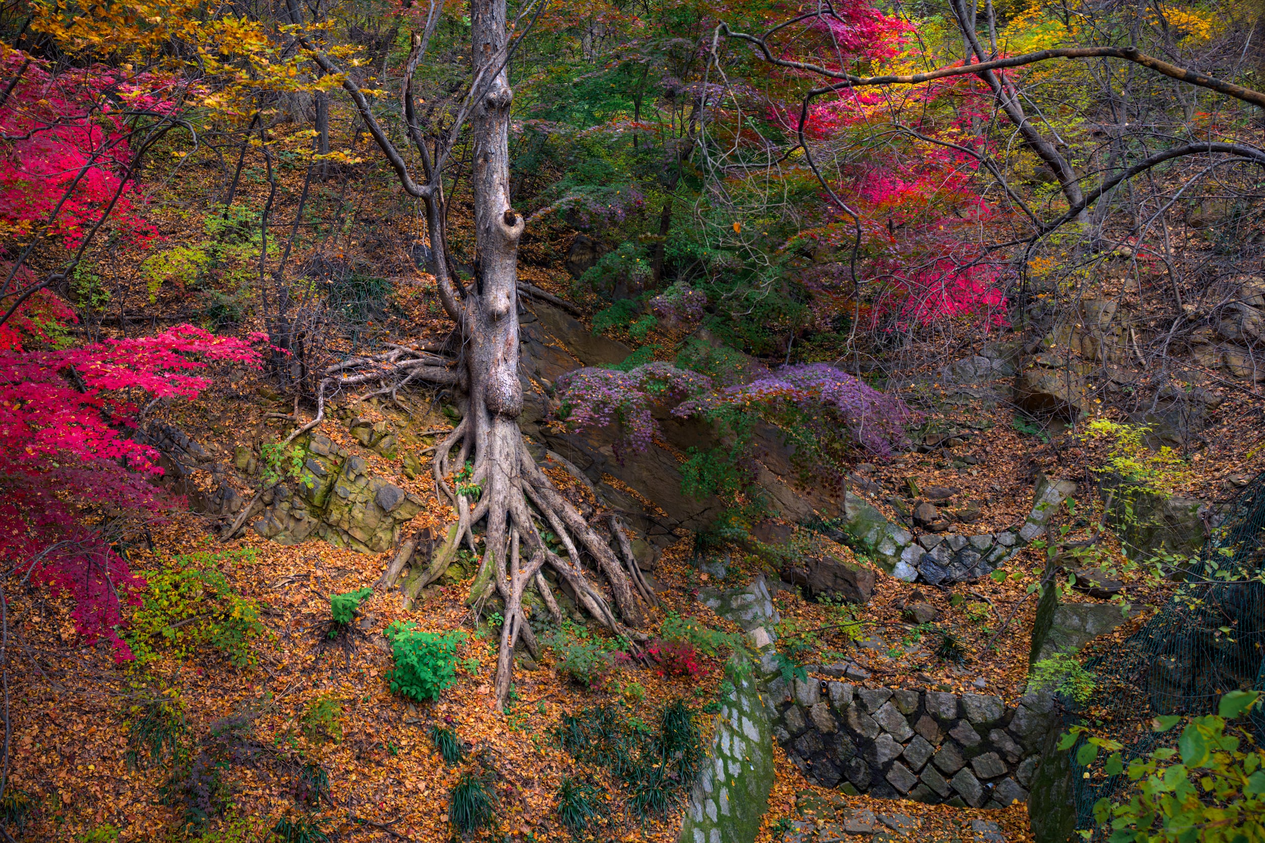 Осенью, в сезон танпхун, когда клены вспыхивают насыщенными оттенками красного, это место превращается в настоящий природный шедевр. Кажется, будто вы оказались внутри живой картины: уютные аллеи, тенистые тропинки, изящные павильоны и древние храмы утопают в огненной листве.