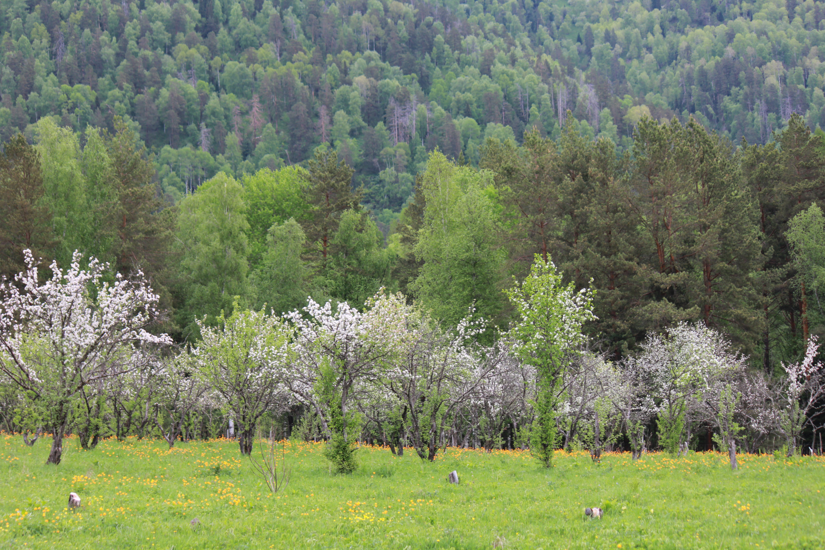 Май. На Телецком почти лето. Тайга благоухает. Зелень пока нежная, но такая яркая, что кажется, будто кто-то дерзко добавил контраста в краски.Каких только цветов не встретишь в эту пору ветреницы уже не такие скромняшки, уверенно заняли они свои позиции, целые поляны усеяны этими нежными белыми созданиями. Хохлатки, кандыки, медуница тоже подокрепли и часто растут по соседству, продолжая палитру. Уже можно встретить цветущий бадан, завораживающей нежности сон-траву. Да и в целом, цветет Всё! Каждый камень и все скалы до самой воды. На склонах гор можно видеть не только маральник, но и черемуху, грушу, яблони, вишню. Запах просто сносит крышу! А теперь добавьте сюда водную гладь Телецкого озера и горы с еще белыми вершинами вдали! Всё! На этом хватит!