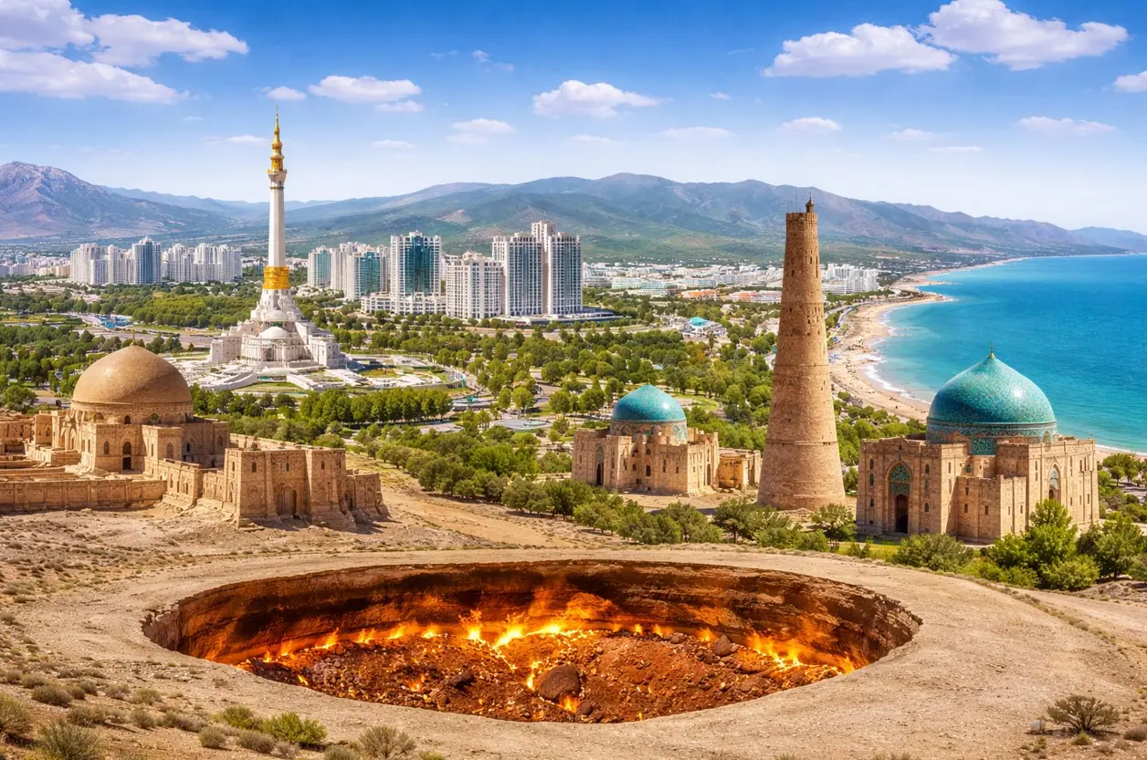 Туры в Туркменистан чаще всего строятся вокруг Ашхабада, древнего Мерва, Куня-Ургенча и газового кратера Дарваза. Именно эти точки регулярно встречаются в классических и комбинированных маршрутах, потому что позволяют увидеть и современную столицу, и археологические памятники, и пустынные пейзажи страны.